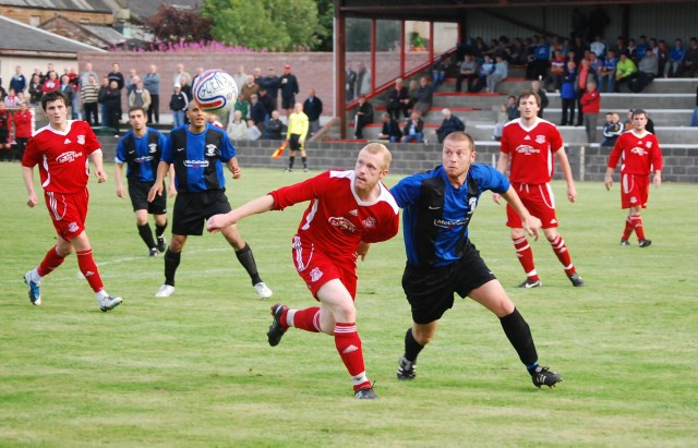 Glenafton made two changes from the eleven that started at Renfrew on Saturday, Cameron Menzies coming in from captain Robbie Henderson and Stuart Currie for Andy Bell. The home side exploded out the traps and a one two between Craig McEwan and Gareth Campbell ended with Southy’s low drive being tipped wide of the post by keeper Darren Johnston. From the resultant corner kick a powerful Paul McKenzie snapshot was blocked in the box by Iain Fulton and soon after a Kris Mitchell whistled past Johnson’s other post. On 4 minutes Girvan broke upfield and a header to the near post caught the home side napping allowing Stevie O’Donnell to score from close range. The home side struggled to respond to this early set back and there play lacked rhythm and purpose. Gareth Armstrong did test Johnson with a half-volley from the edge of the box but the bulk of the action was at the other end with striker John Bradford proving a handful for the Afton back line. Semple punched the ball from the head of Fulton and then dived to stop a Stuart Peacock effort as the visitors looked to extend their lead.