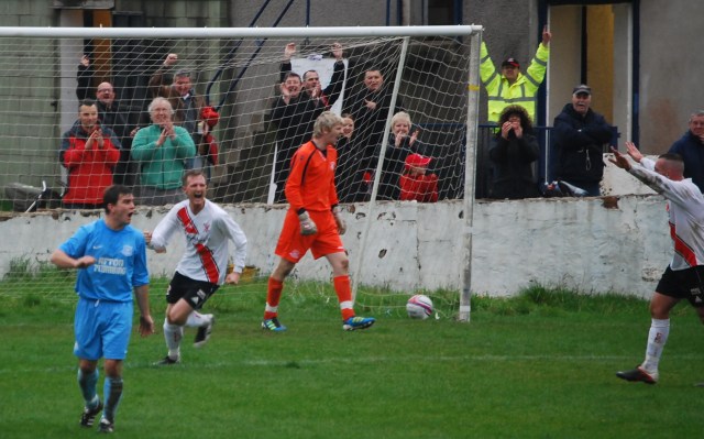 As is their way the Glenafton head stayed aloft and they almost drew level immediately as Hamilton struggled to hold a cross from Campbell but Sloan’s attempt to net the loose ball was cleared off the line by Moffat. However, on 62 minutes the big defender was outjumped in the box by Gareth Armstrong and his looping header outfoxed Hamilton and the ball dropped unperturbed and nestled into the net at the back post.