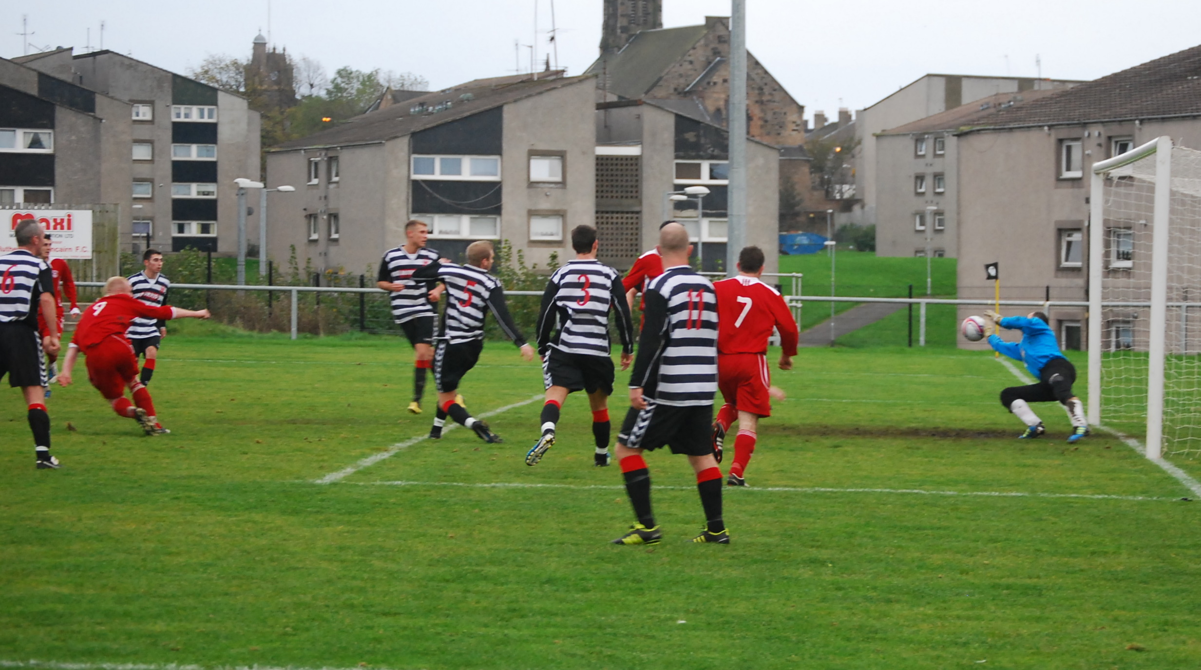 On 20 minutes Richie McKillen and Paul Murphy combined to release Paul McKenzie in the box and although his low drilled shot was spilled by Allan ‘The Cat’ Colquhoun the keeper quickly recovered the ball at the second attempt. Five minutes later the keeper got his right paw to a left footed drive by Gareth Campbell from the 18 yard line and pushed the ball over the bar. Five minutes further on and at the other end Ally Semple was alert to get both fists to the ball and punch it from the head of the leaping Mark McCurry .