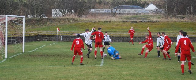 Glenafton gave a debut to Gus Cochrane a midweek loan signing from Stranraer. The 17 year-old midfielder’s clever touches and intelligent use of the ball was one of the few highlights for the home side in a fairly uneventful first half. Despite enjoying much of the possession and playing with the strong, but icy, wind at their backs the Glens failed to seriously test keeper Jim Catterson from either open play or from the considerable collection of corner-kicks earned.
