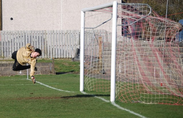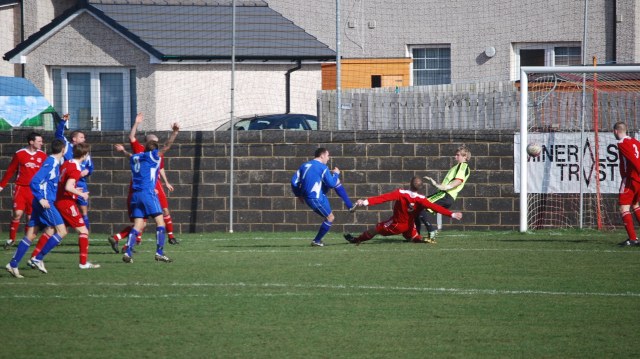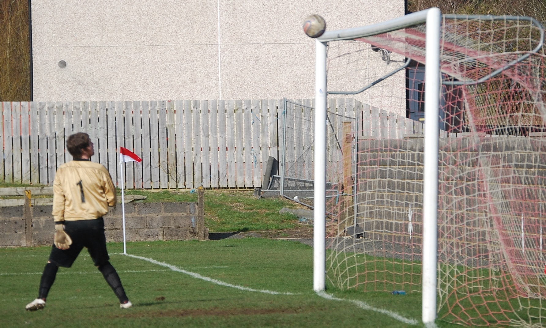 Back came Glenafton and Boyle tested McLeay from both outside and inside the box the keeper coming out on top on both occasions; the latter at the expense of a corner which the keeper raised above defenders and attackers alike to punch clear with great vigour. On 73 minutes Colligan danced his way down the right flank but his cross for Armstrong in the box was cleared by Heffron straight back to the midfielder – his shot for goal then saved well by McLeay. Three minutes later another burst by Colligan saw him sail past Smith and Currie only to be blocked by Heffron before he entered the box, cried for obstruction waved away. The home side’s pressure paid off in spectacular fashion on 81 minutes when Gareth Campbell killed the ball dead some 30 yard out, took one look up, and blasted the ball into net beyond the diving McLeay, the rigging still bulging as the keeper fell forlornly to the ground.