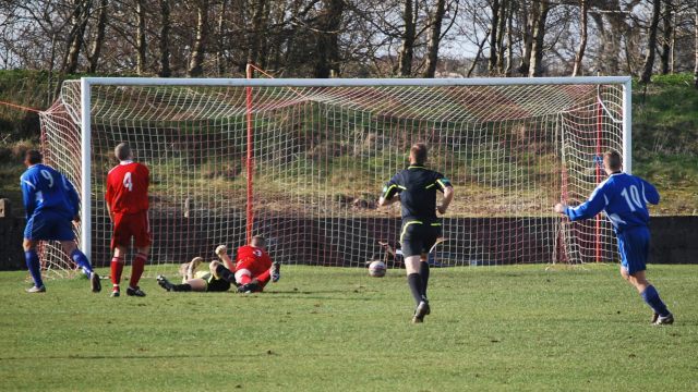 Bright sunshine bathed Loch Park as Glenafton threatened to get off to a dazzling start when they caught Renfrew cold in the opening minutes. Gareth Armstrong rolled the ball wide right for Gareth Campbell to gather and in a flash he whipped the ball across the face of the ‘Frew goal where John Paul Boyle, having left Anton Heffron chasing shadows, came within a whisker of tapping in the opener. The visitors didn’t take long to heat up however and on 6 minutes David Gordon picked out Willie Sawyers in the box and the big striker held off Craig Menzies as he made his way to the bye-line from where, as other Glens’ defenders congregated, he cut back the ball into the six yard box and before the cries of hand-ball had subsided Colin Forbes pounced to poke the ball in at keeper Ally Semple’s near post.