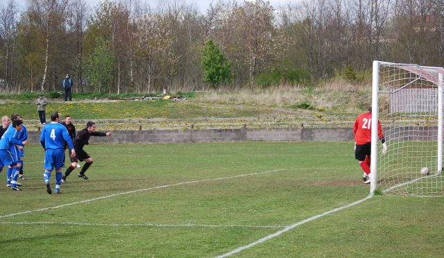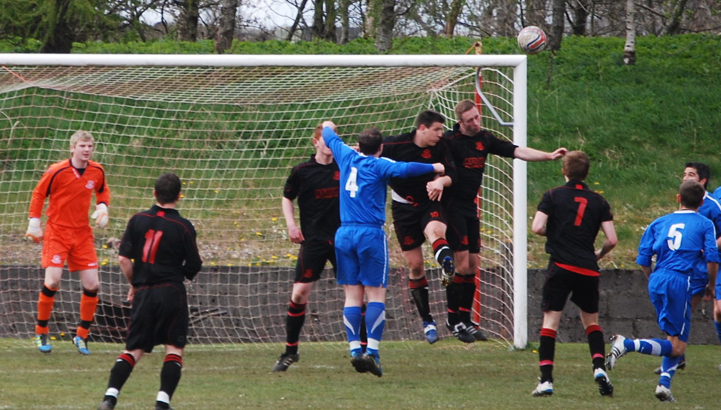 Home keeper Ally Semple had to be alert and rush to the edge of his box to clear from the feet of Joe Barclay as he looked to capitalise on a slack pass back and open the scoring in the opening ten seconds. Ten minutes passed before the home side posed a threat when a Craig Menzies cross picked out Paul McKenzie in the six yard box but the midfielder couldn’t guide his header on target. Four minutes later McKenzie’s trickery left two blue shirts sprawling on the ground as he waltzed through the box only for the ball run free before he could test keeper Michael Duke. Barclay for the visitors continued to look lively up front keeping the home defence on their toes who responded well ensuring that Semple was seldom called into action, until the 17th minute, when a Francis Kelly drive from 20 yards out had the keeper diving low and at full stretch to push the ball away. Two minutes later a good run by Philip Dolan ended with his shot at goal sailing Semple’s bar.