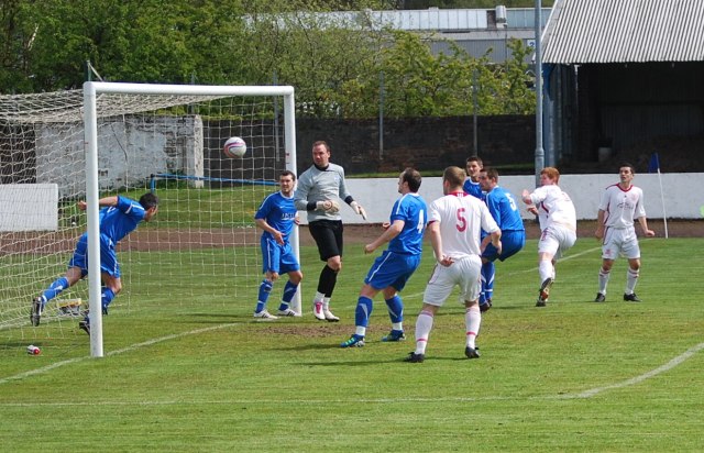 The visitors started the second half in determined fashion and waves of attacks saw them breach the Kilsyth box four or five times in as many minutes with McKenzie and John Paul Boyle darting past the blue shirts at will. A McKenzie volley whizzed wide of Duke’s post and then the keeper showed a safe pairs of hands to hold a Paul Murphy shot. On 50 minutes and in their first attack of the half Darren Dalrymple, the recipient of a throw-in deep on the left wing, whipped the ball over the face of the Glenafton goal and although Graham McLaren’s header crashed off the post Francis Kelly stooped to head the rebound home. A minute later Robbie Henderson was alert to bravely block a Dalrymple drive as the home side looked to double their advantage.