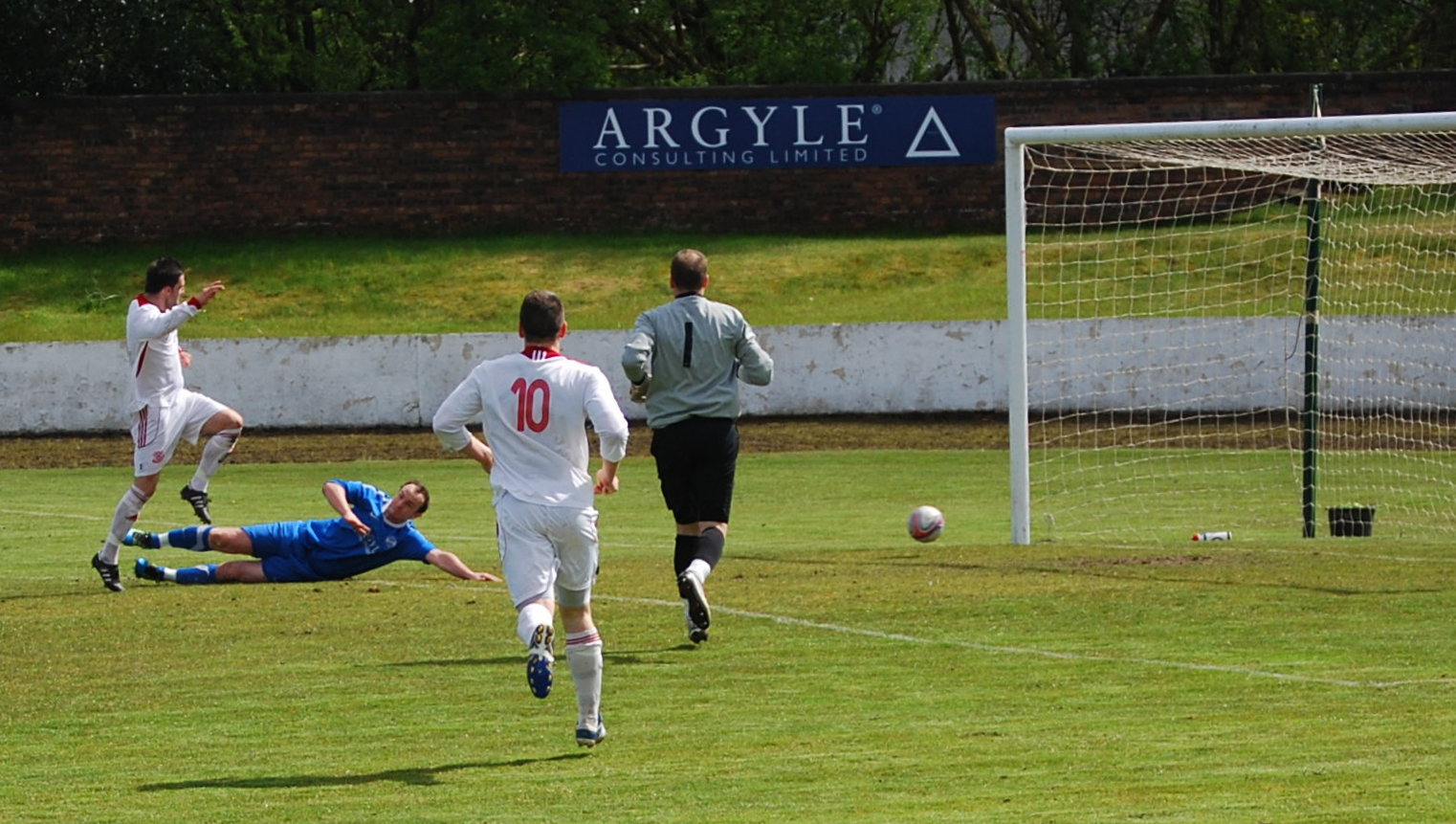 The visitors regrouped and on 56 minutes drew level when pressure from McKenzie and Dempster forced Dalrymple to attempt a pass back to his keeper but in nipped Boyle to steal the ball and skipped past Duke and headed for the empty net only for a touch to take him wider than intended. Although Duke had given up the ghost his central defenders homed in on Boyle, but the Glens man regained his composure and calmly cut the ball back for the inrushing Gareth Campbell to blast the ball into the gaping net from 8 yards.