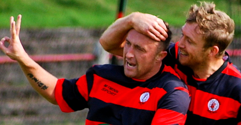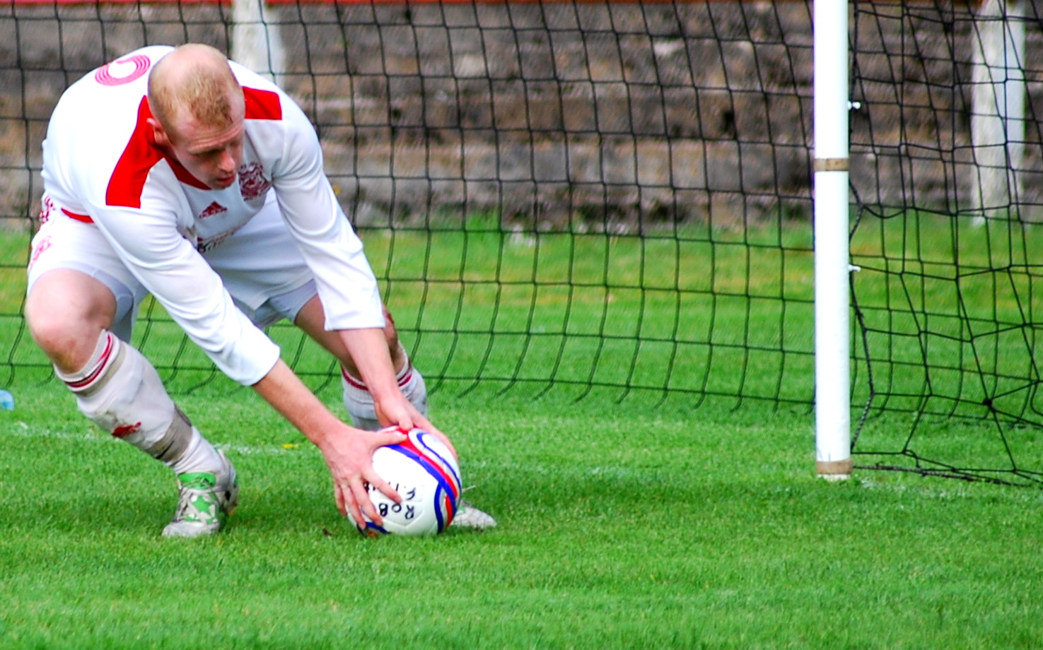 Midway through the half the visitors forced their first corner kick of the match which was scrambled clear only to be hooked back into the danger area by Paul McKenzie where the ball was met by Gareth Armstrong but his diving header went inches wide of target. On 24 minutes the Glens continued to press and pulled one back when Danny Mitchell gathered the ball and fired from outside the box, the ball taking a wicked deflection to wrong foot the helpless Robertson. Both sides created a couple of half-chances before the visitors struck again on 32 minutes after Armstrong rose majestically at the near post to head flick a Colligan corner into the six yard box where John Dempster’s determination saw him beat two defenders and the keeper to the ball and force it over the line. Two minutes later Glenafton’s hopes of a sensational comeback suffered a serious set-back when Mitchell earned a second yellow card for a sliding tackle on Adam at the half-way line.