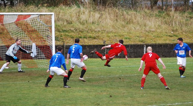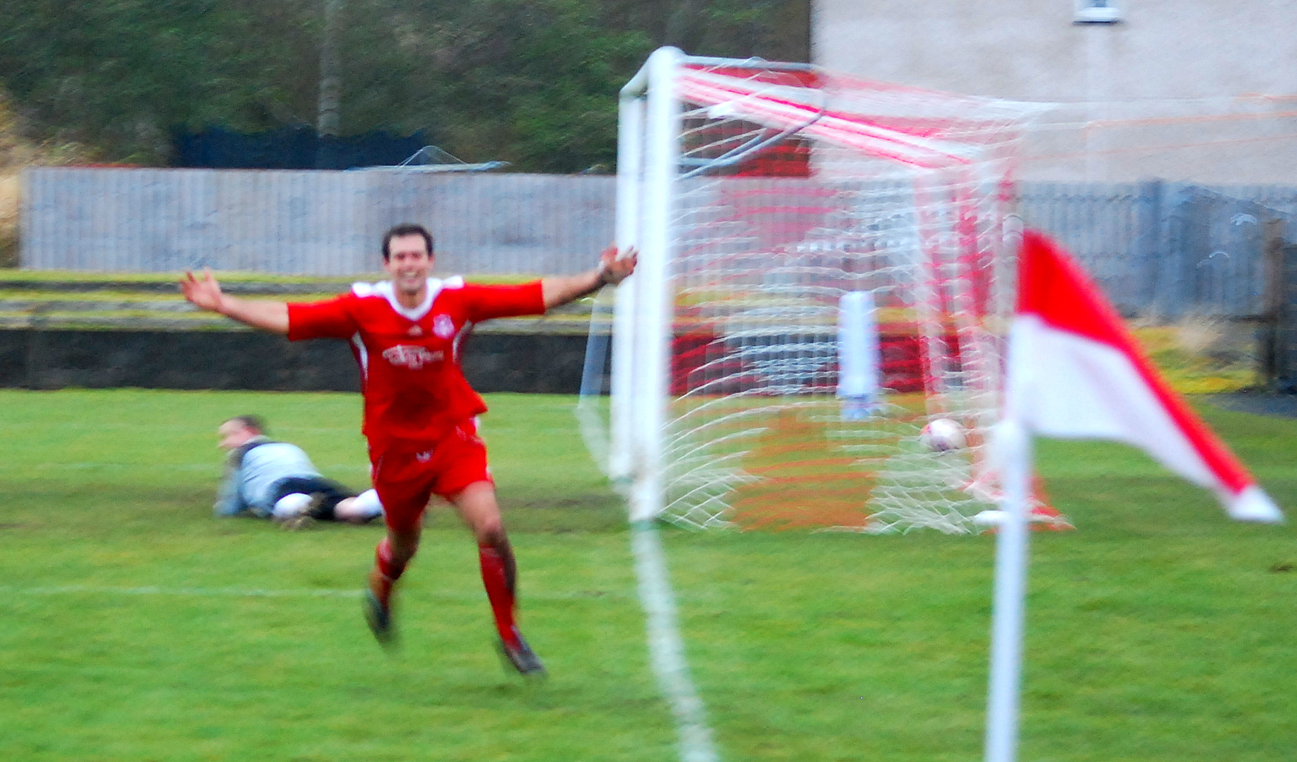 At the other end a dangerous ball in from the left was met by the gambolling Gibson at the back post but the quality of his header failed to match that of his leap and ball ended well off target. Glenafton responded with a slick passing move on the sticky surface. McKillen broke down a Meadow attack on the edge of the box and fed McKenzie in midfield, he then in turn picked out Dempster wide on the right. Cutting inside he deposited the ball with Craig Potter on the outskirts of the box who rolled the ball wide left to the overlapping McKillen to slip it back into the danger area for the incoming Dempster and although his shot beat Wardrope it went inches wide. On 73 minutes Wardrope blocked Dempster’s powerful shot but the offside flag was up in any case, however McKenzie had only eyes for the rebound and volleyed it into the net from 18 yards out, only to be booked for wasting time! The pair then combined to take the ball to the dead ball line where Dempster’s cut back looked destined for Murphy only for the alert Gibson to make a last ditch clearance.