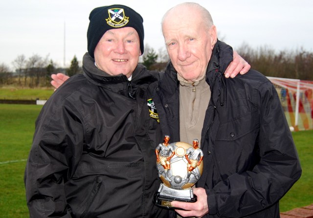 To mark this occasion Glenafton Athletic were delighted to present Danny with a memento of those memorable games with Pollok. The club would like to thank Mr Jim Gilligan of Pollok F.C. for making the official presentation during the half-time interval. Always the joker, Danny as he stood in front of the nets that he knew so well, said ‘ My eye-sight isn’t what he used to be but I’m glad to see the Glens go in at half-time 1-0 up!
