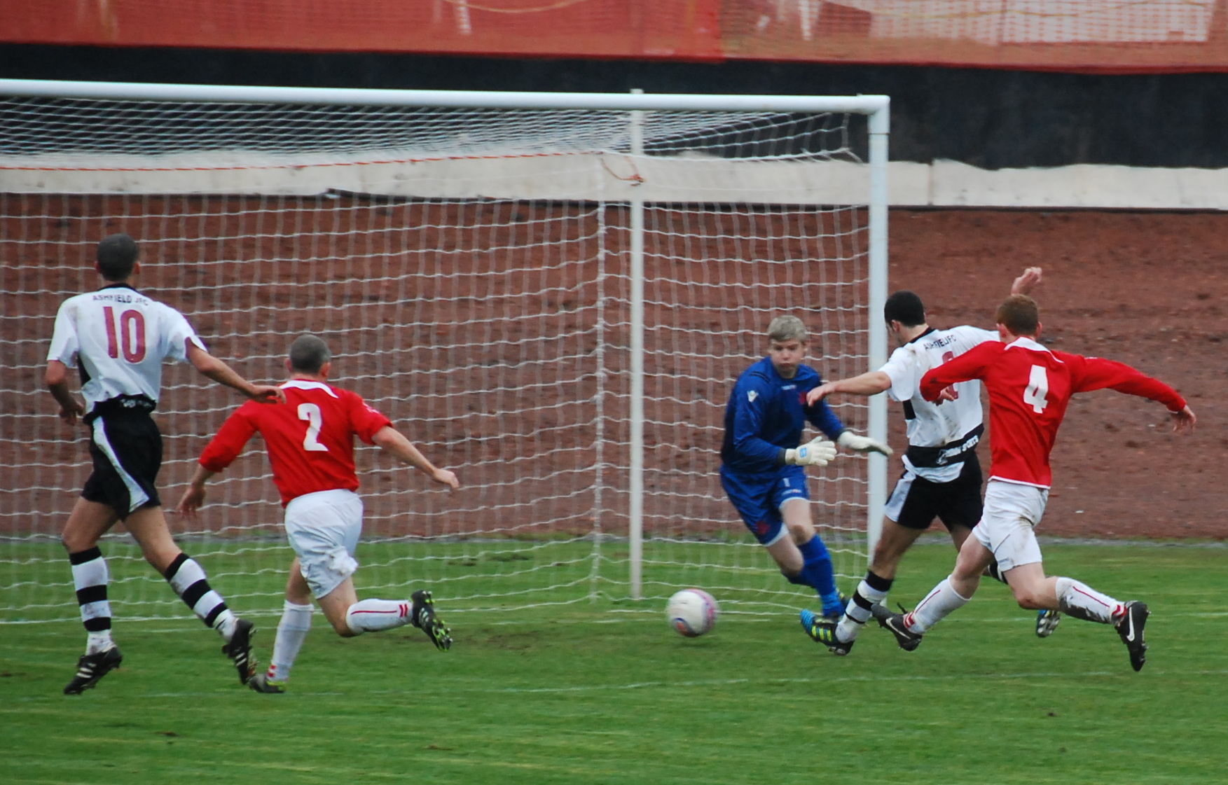 Midway through the half Ashfield burst into life when Thomson picked out Gary McCann on the half way line and the tricky winner exploded down the right flank leaving a host of red shirts in his wake before whipping the ball across the face of goal beyond the reach of Semple only for Craig Potter to keep a cool head and guide the ball behind and deny Shaun Fraser a tap in at the back post. Following some head tennis from the resultant corner the ball fell for Jim Smith in the six yard box but an alert Semple did enough to block the danger, if only temporarily. For soon after, on 24 minutes, a Glenafton attack broken down in the home box was mopped up by Paul Maxwell who in turn released the mercurial McCann and on this occasion he ventured deeper into the visitors’ box before cutting back a wicked ball which was met by the incoming Chris Hall and blasted home from three yards out. Three minutes later Maxwell set Smith free and although he got behind the Glens’ defence the back-tracking Ryan McChesney and Semple combined to foil the striker.