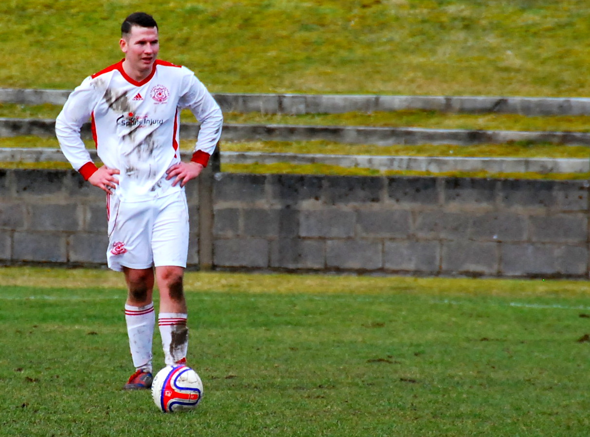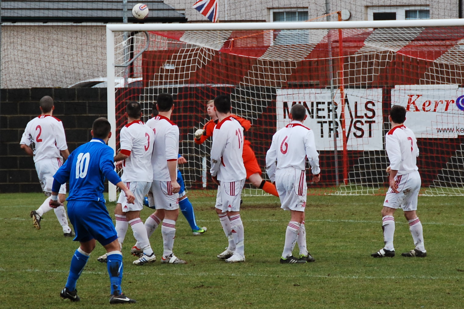 Back came Glenafton and on 26 minutes Craig McEwan’s pass caught the Peasey defence flat-footed allowing John Dempster to break into the box only to be denied by the fleet-footed White who rushed from his line and made an excellent block. A minute later Robertson in the centre circle picked out Craig Menzies on the right flank and he combined well with Dempster who in turn saw off the attention of Danny Smart at the corner flag to fire the ball to the back post where Robertson rushed in ahead of Ross McCabe to bullet the header past White. But again, the goal was disallowed after Dempster’s cross was adjudged to have gone out of play. Three minutes later Robertson beat McCabe in the air again but his header sailed over the bar.