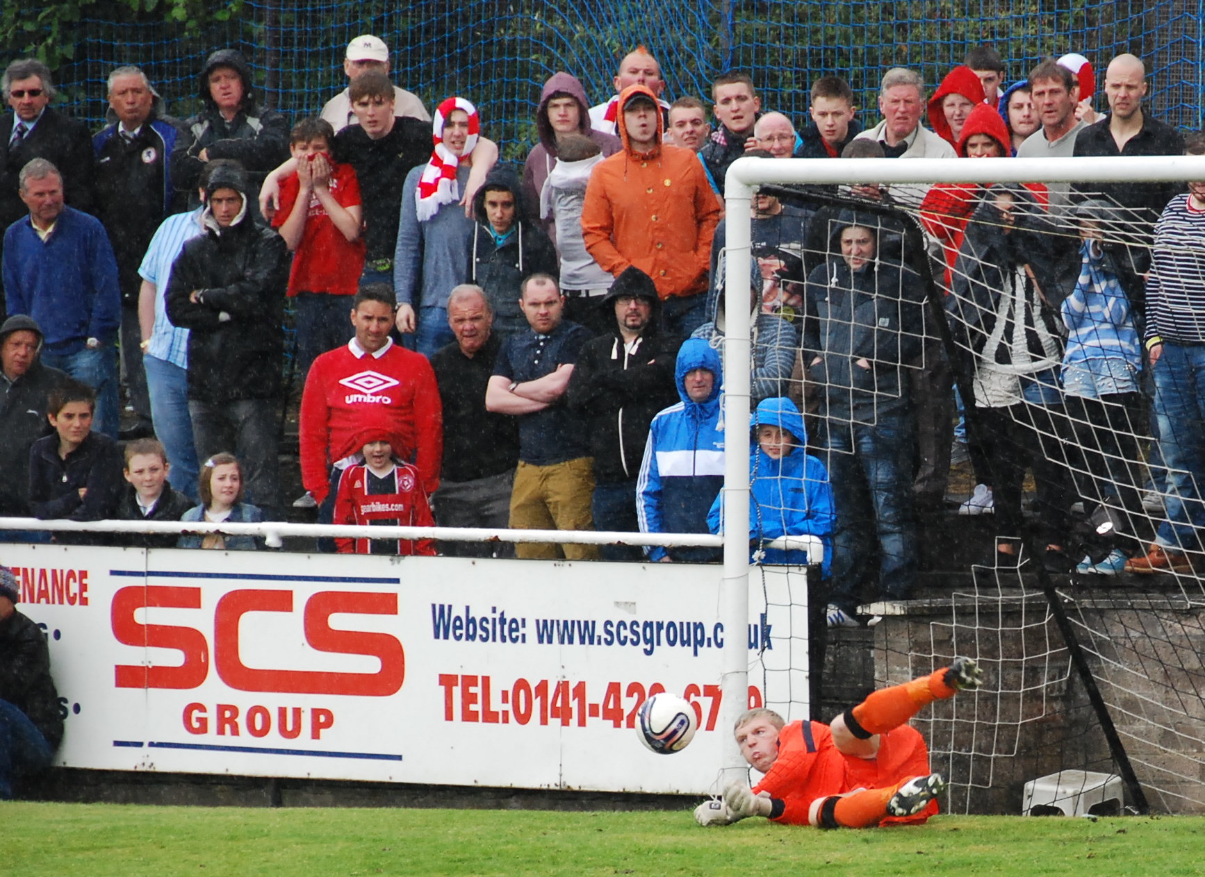 With three minutes of regulation time remaining Glenafton were awarded a free kick at the right hand corner of the penalty box. Campbell’s chip to the back post was headed clear by Shaun Stirling to the edge of the penalty area where Robertson quickly played the ball back into a packed six yard box and as it broke loose Gareth Armstrong lashed it into the roof of the net.