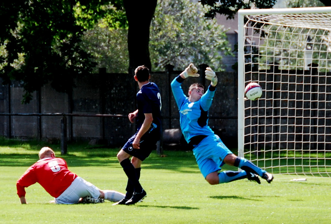 On a glorious day it was the silky Sloan that carved out the first chance in 5 minutes but his angled drive from the edge of the box just failed to hit the target. The game quickly settled into a period of keenly contested end-to-end play albeit short in real chances. Midway through the half the visitors took the upper hand and on 25 minutes keeper Euan Drysdale managed to take the heat of a Gareth Armstrong’s header and a defender was on hand to clear the ball of the line.