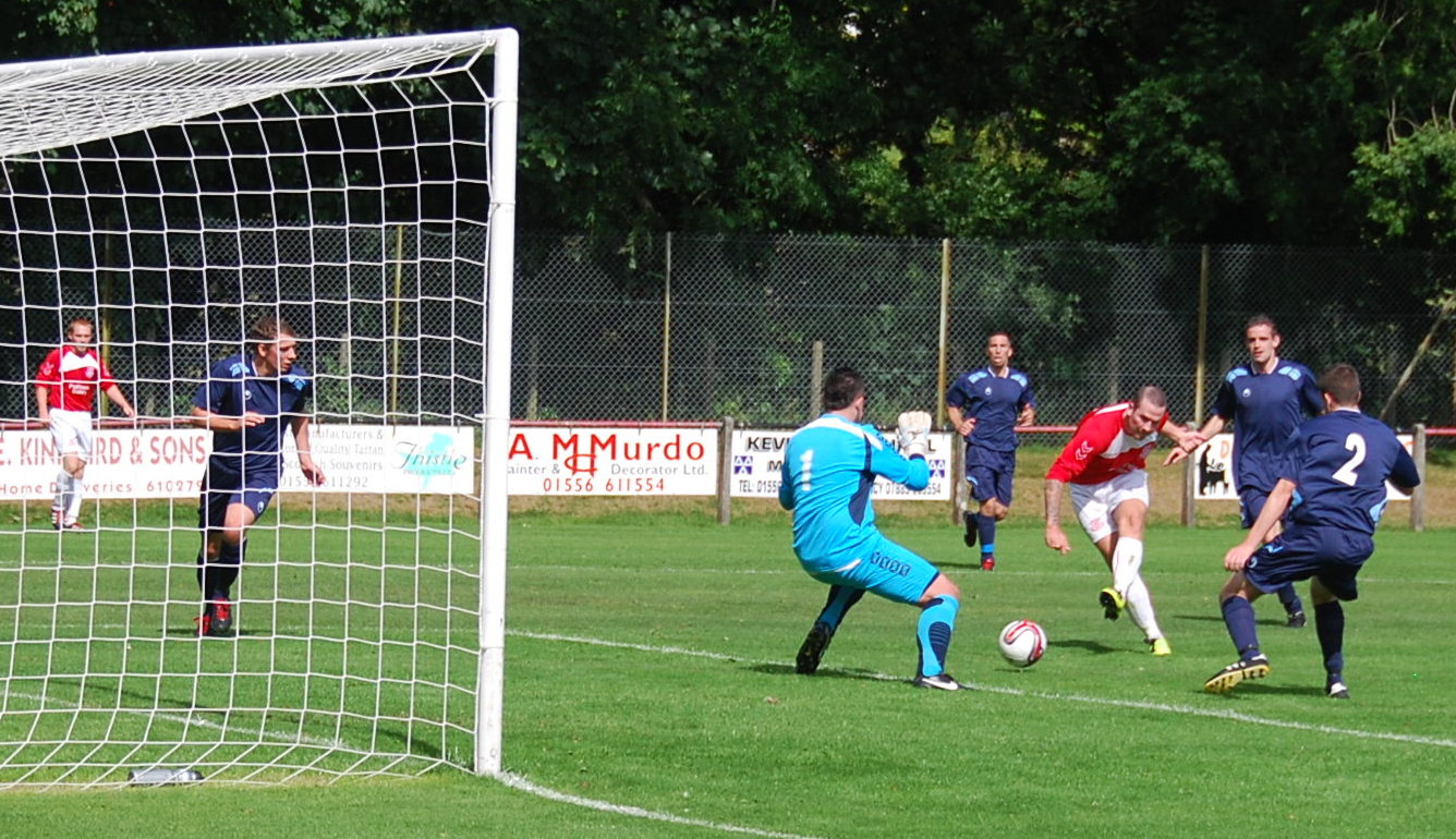 With their tails the hosts pushed forward and a last ditch tackle deep in the box by Craig Menzies brought a mazy run by Sloan to an end.Back came Glenafton and all but the last kick of the half Drysdale pulled off a fine save from a close range Robertson effort. H/T Dalbeattie 1 Glenafton 1