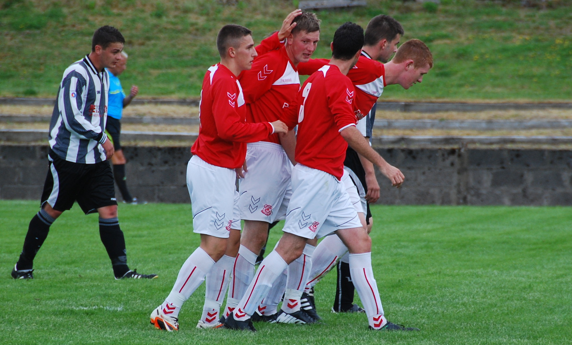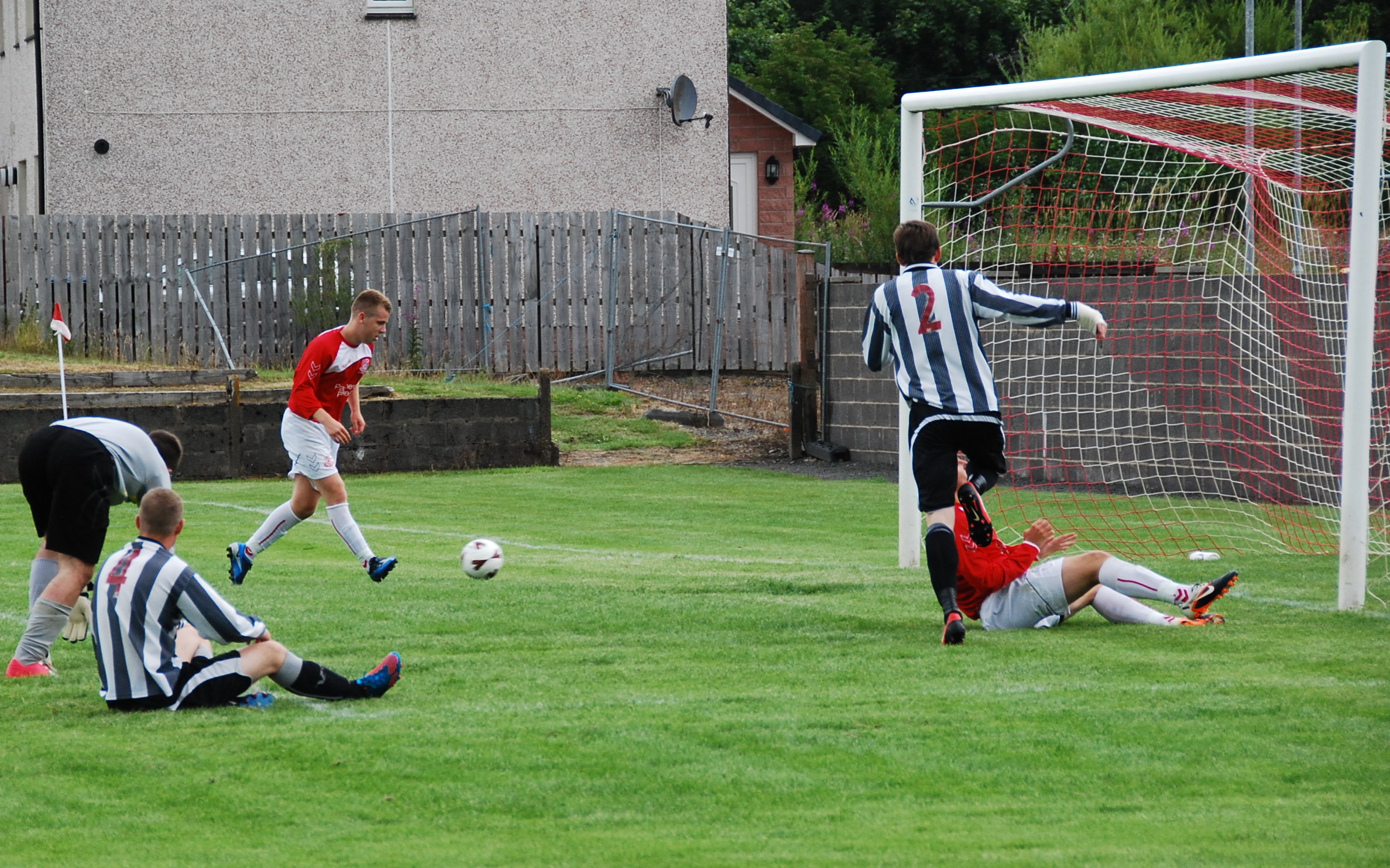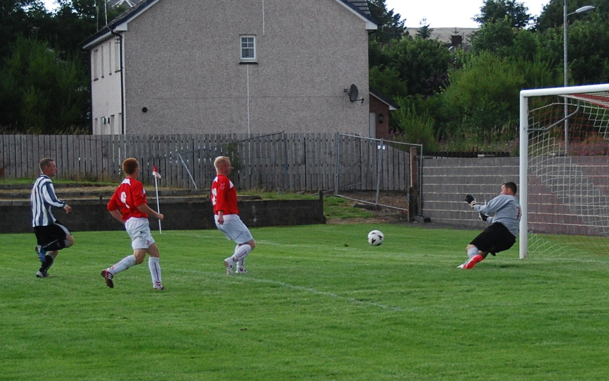 Four minutes later trialist Jamie McKernon was tripped at the edge of the box and despite strong appeals for hand ball from John Craig’s free kick the home side had to settle for a corner kick from the same player which saw Scott Adam soar and send a looping header into the back of the net.