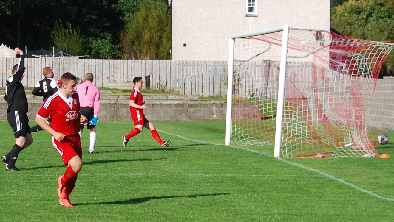 Two minutes later Findlay Frye released Alan Cairns down the left and his run into the box was brought to an abrupt end when the clear pair of heels he had shown Alan Kerr where whipped from him by the chasing defender. Jamie McKernon powered home the penalty kick to double the hosts’ advantage.