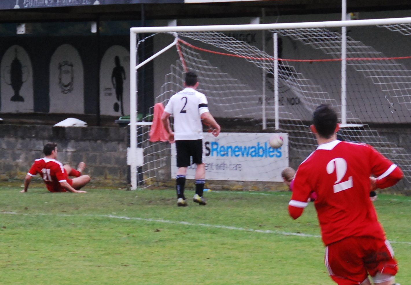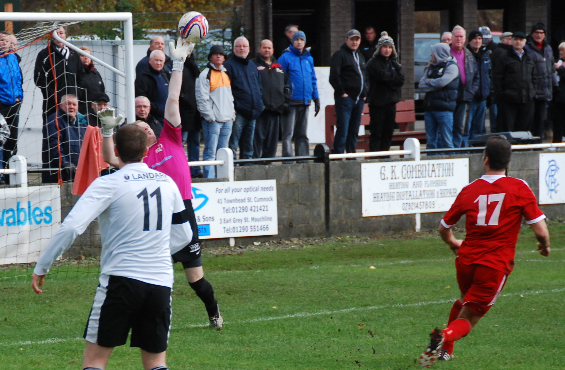 On 20 minutes Cumnock conceded another free-kick at the edge of the box after Wood brought down Connolly. Jamie McKernon lined up apparently to curl it beyond the wall but instead calmly rolled the ball into the box for Alain Kinney who blasted the ball goal-ward only for Semple to pull off a stunning point blank save and have the presence of mind to smother the rebound as a posse of red shirts waited to pounce.