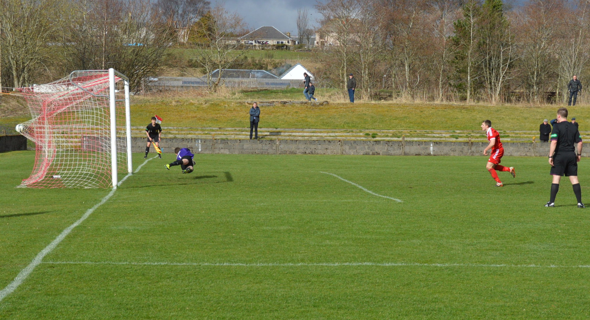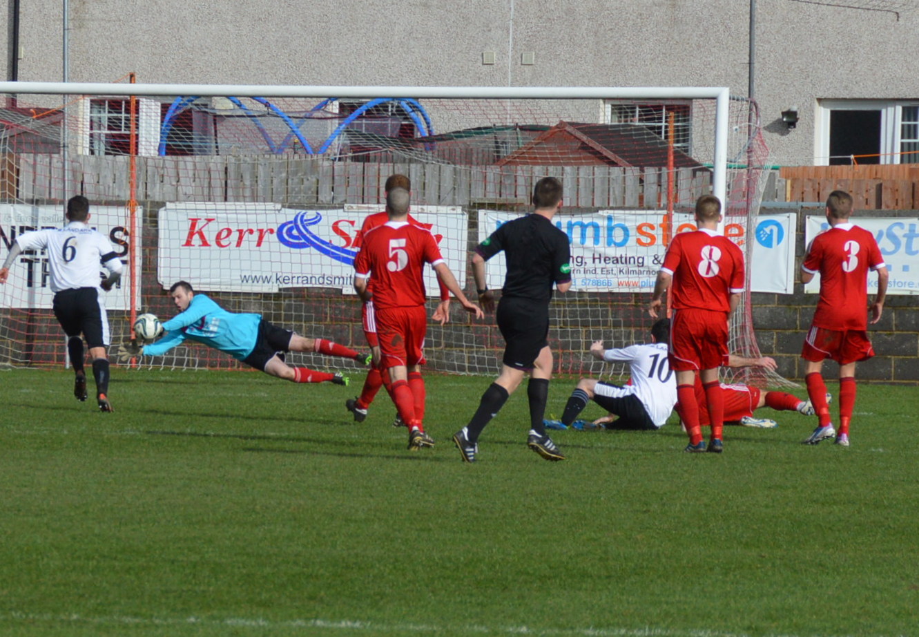Four minutes later Cumnock came close to regaining their lead with Love in the thick of it again. He turned well in a crowded box to engineer a snap shot a goal only for McGarrity at full stretch to pull off a great save and push the ball wide with both hands. From the corner-kick the keeper then blocked Love’s attempt to force the ball home from close range – a spell of play that left the travelling support with their hands on their hands and the home faithful with hearts in their mouths.