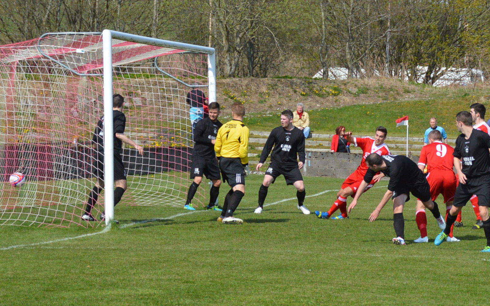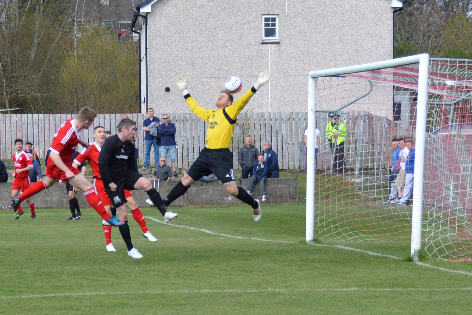 Camelon , a goal to the good from the 1st leg at Carmuirs Park last week, were first to show and top goal scorer Kevin Kelbie was denied a close range header by Brian McGarrity as he rose to cleanly clutch and gather the ball to safety – a sight that would become a feature of the game. A Camelon corner-kick was repelled on 10 minutes as they continued to apply the early pressure.