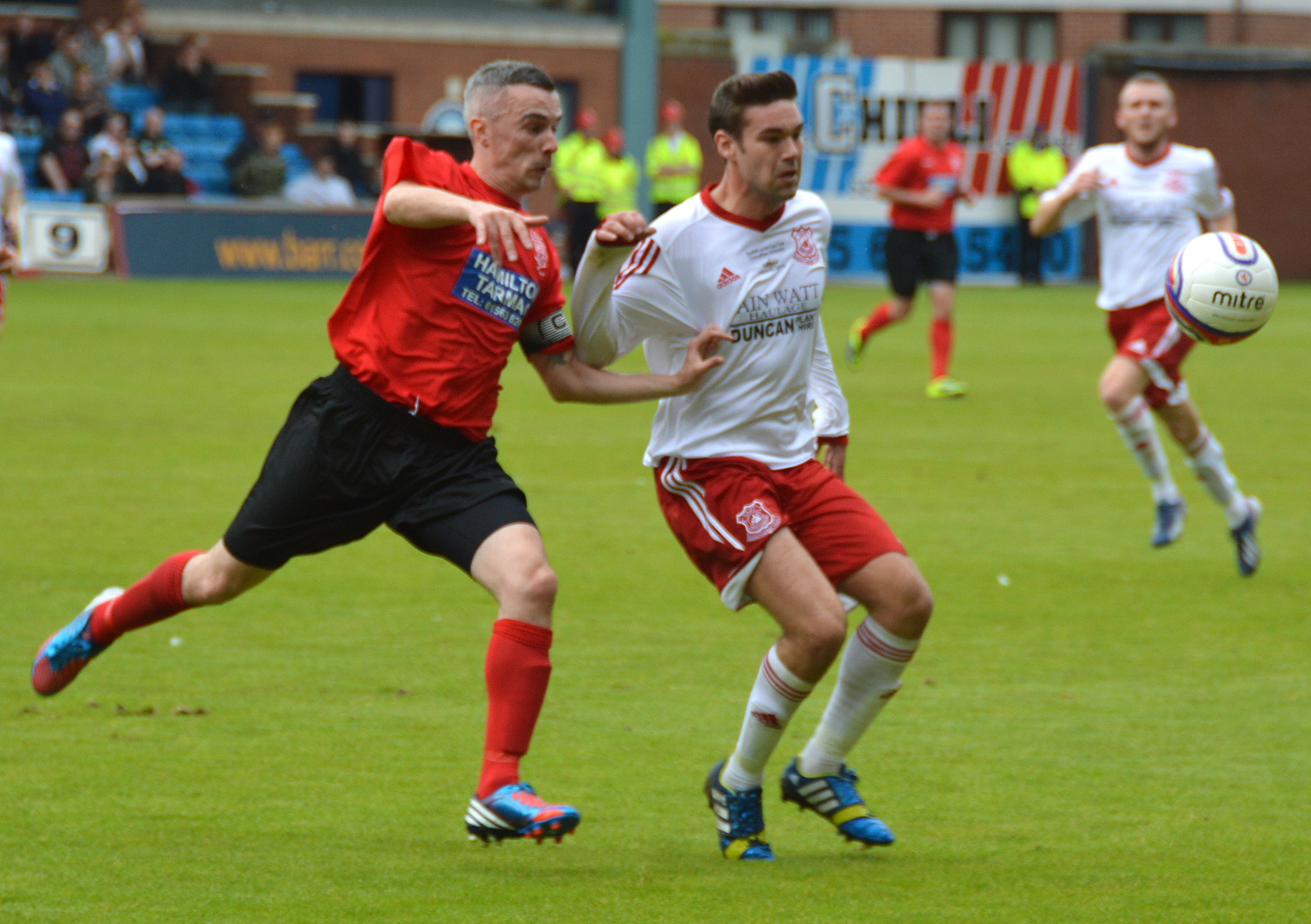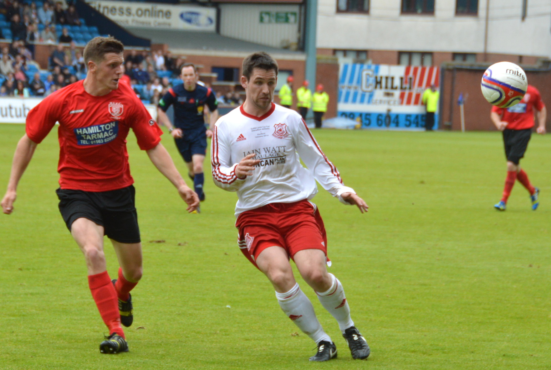 McEwan was booked for taking Watt down as he made for the box and Masterton crashed the subsequent free-kick off the base of the post. During the closing minutes Aaron Connolly left to a huge cheer from a defiant Glenafton support to be replaced by Darren McGill and the young midfielder was soon in the thick of it with a trademark run that was ended by a shirt pull from Byrne.