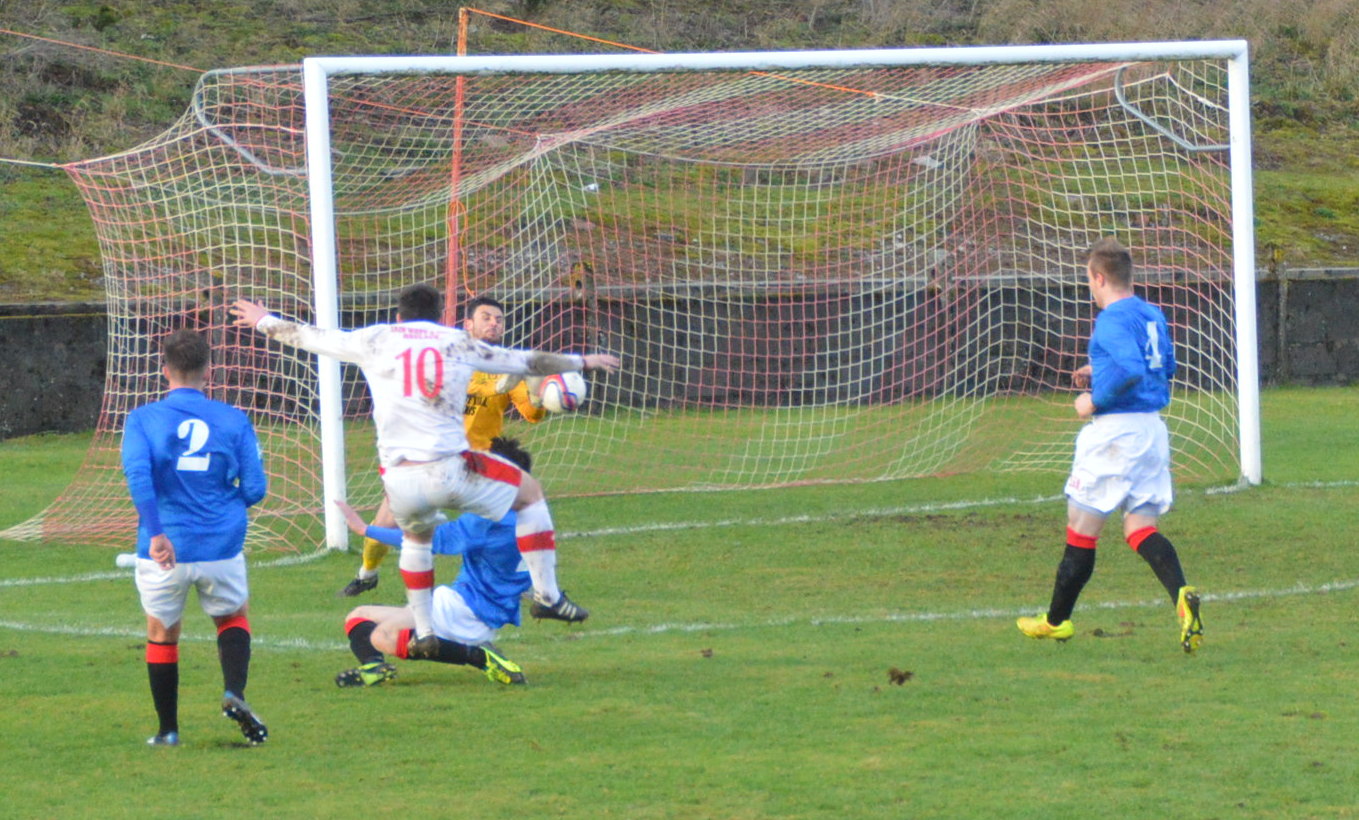 Strachan then cut in from the left and fed the ball to Cameron Marlow, lurking in the ‘D’ of the penalty box, who quickly turned to wrong foot Keenan before lashing a low drive which was turned round the post by Shepherd at full stretch. From the resultant corner-kick Jamie McGeoghegan’s header fell for Alain Kinney deep in the six yard box who managed to squeeze the ball between the keeper and his defenders on the line to put the Glens ahead on 5 minutes.