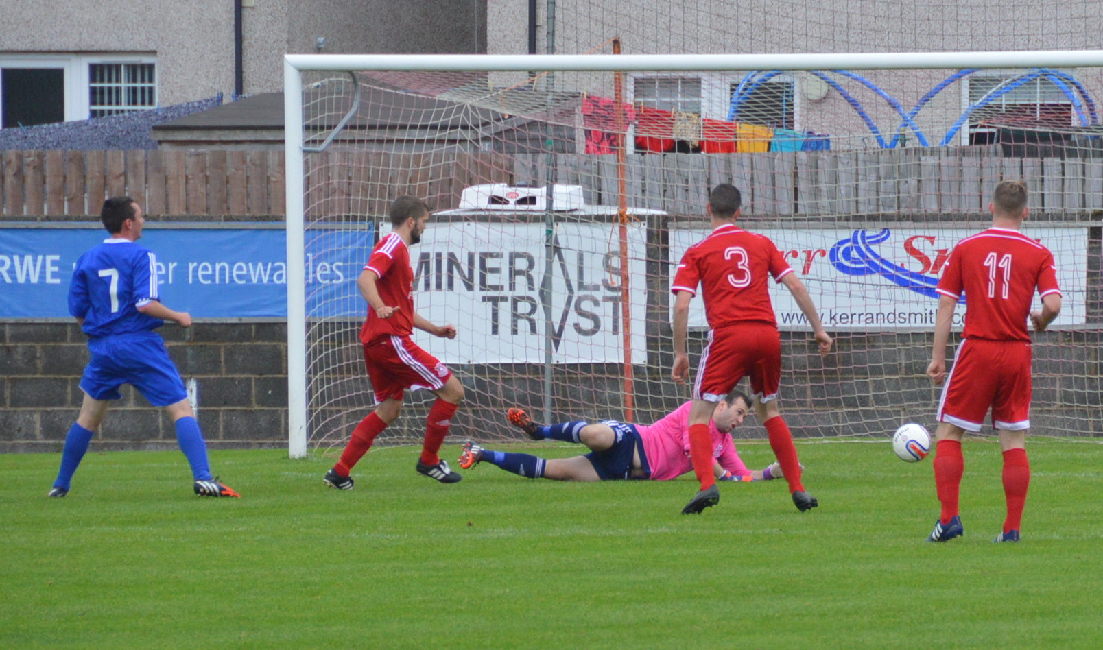 Newmachar’s keeper Ross Chapman pulled off the two great saves to stem the tide and indeed at the other end Stuart Riley pulled off a good save from Glens’ goalie Brian McGarrity.