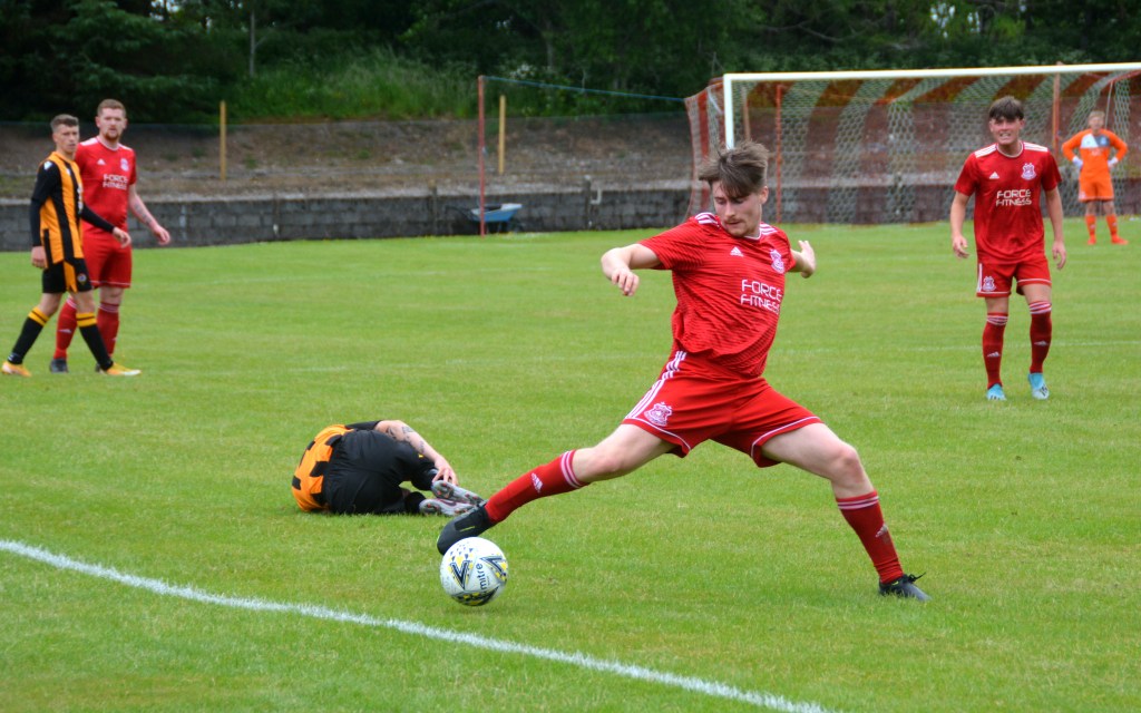 Largs were quickly on the front foot and forced a corner on 51 minutes which was played to the back post where Laurie McMaster’s header battered off the post. The visitors continued to press and both Pettigrew and Fisher both sustained knocks.