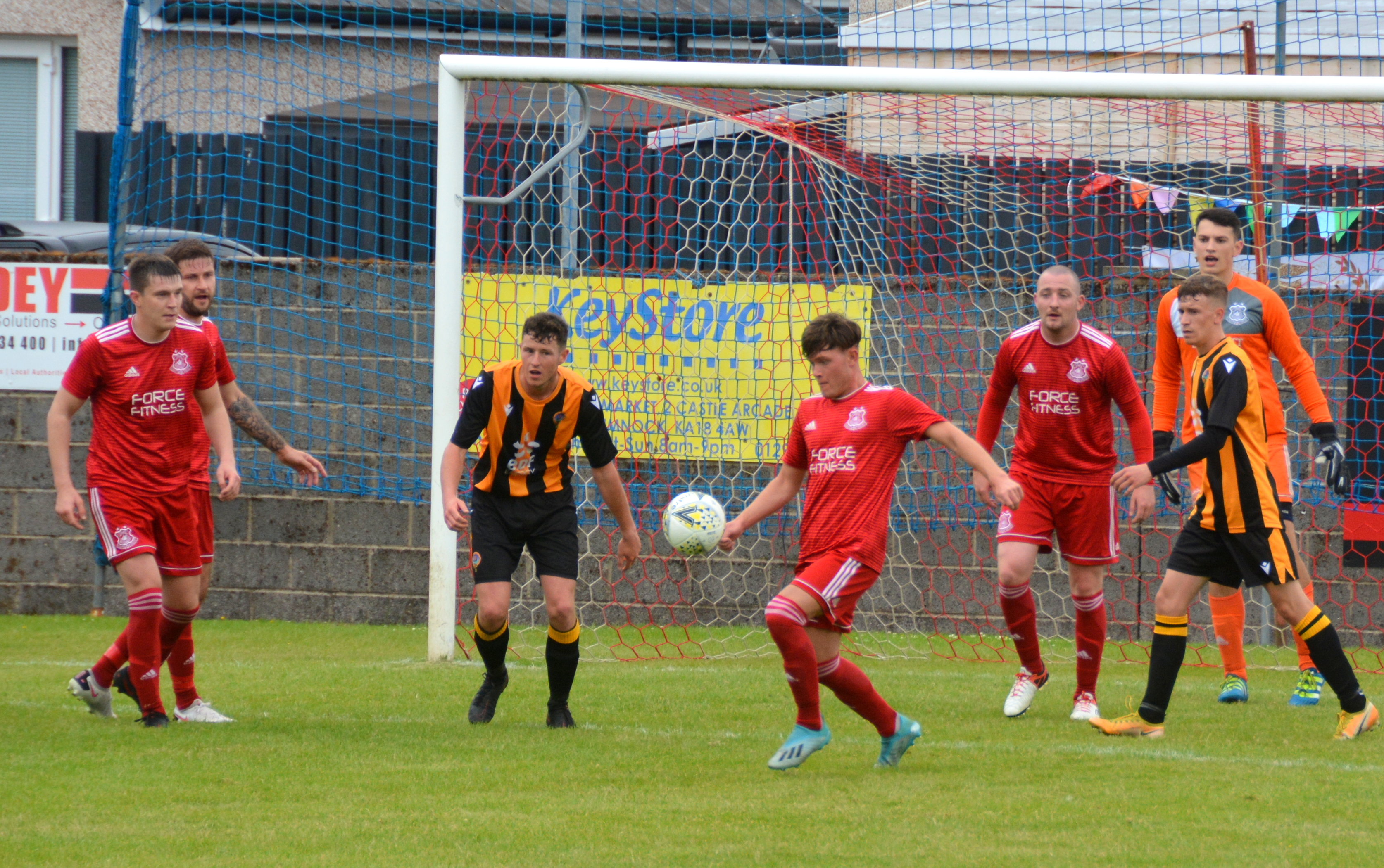 Largs resumed their offensive and Sloan rushed from his line to clatter the incoming W. Sewell on the outskirts of the penalty box. Sewell’s free-kick was deflected over the bar and the ensuing corner kick was partially clearly before Thistle set up another attack that again was repelled with red bodies putting their bodies on the line.