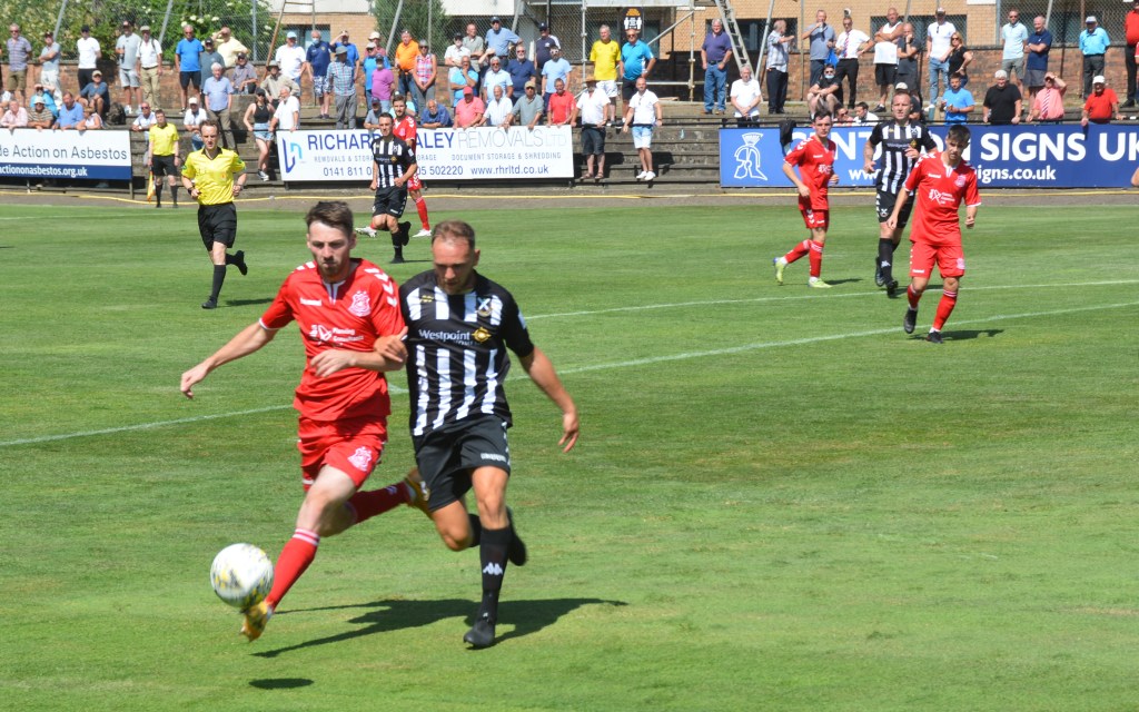 Pettigrew pushing down the left flank lofted a ball to the far side of the box for Murphy to chase and although he was impeded by Mackenzie’s holding, it was the Pollok defender that fell to the ground to win a free kick. Yet, a minute later Fisher launched a long ball down the right for McKee to chase into the box with Bradley by his side and when the Glens man tumbled, claims for a free kick were wave away.