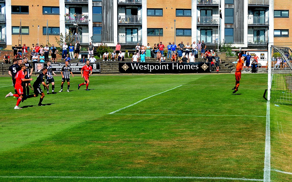 Justin Devenny then floated a Glens free-kick into a crowded box with Longmuir rising to double-fist it out for a throw only for Sean Bennie to launch it back from where it came and this time Paul Gallacher won the aerial battle to clear the danger. This promptly sparked another lightning streak up the right by Grant who switched the play to the left and although the Glens defence stifled this attack the ball was eventually arrived on the right-hand corner of the box which Grant flicked up before thumping a shot that thundered off the top of the bar and out of play.
