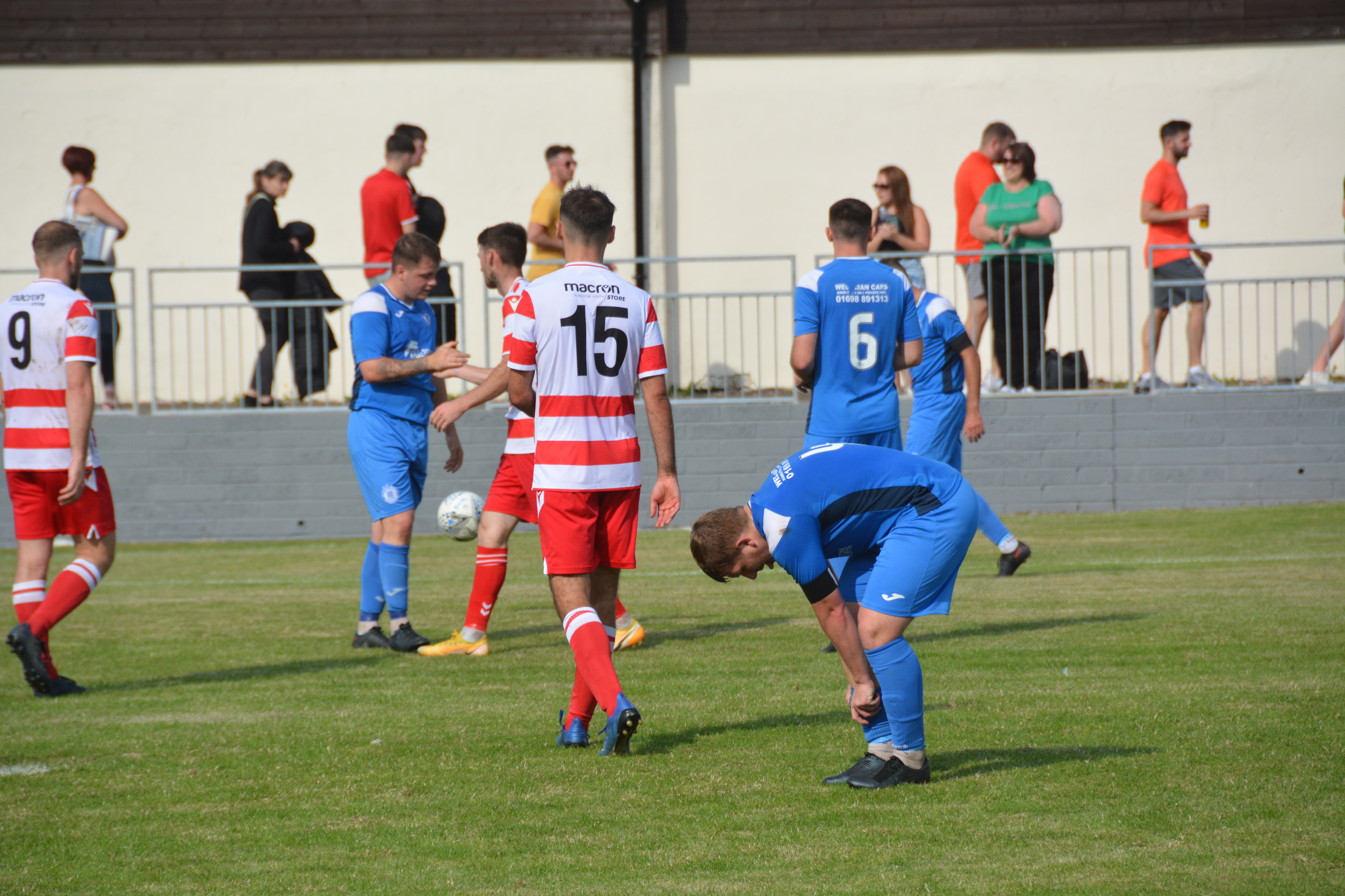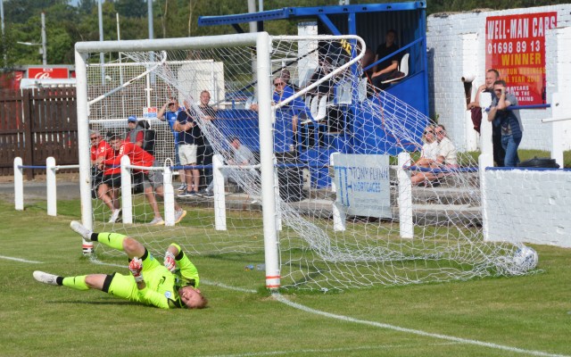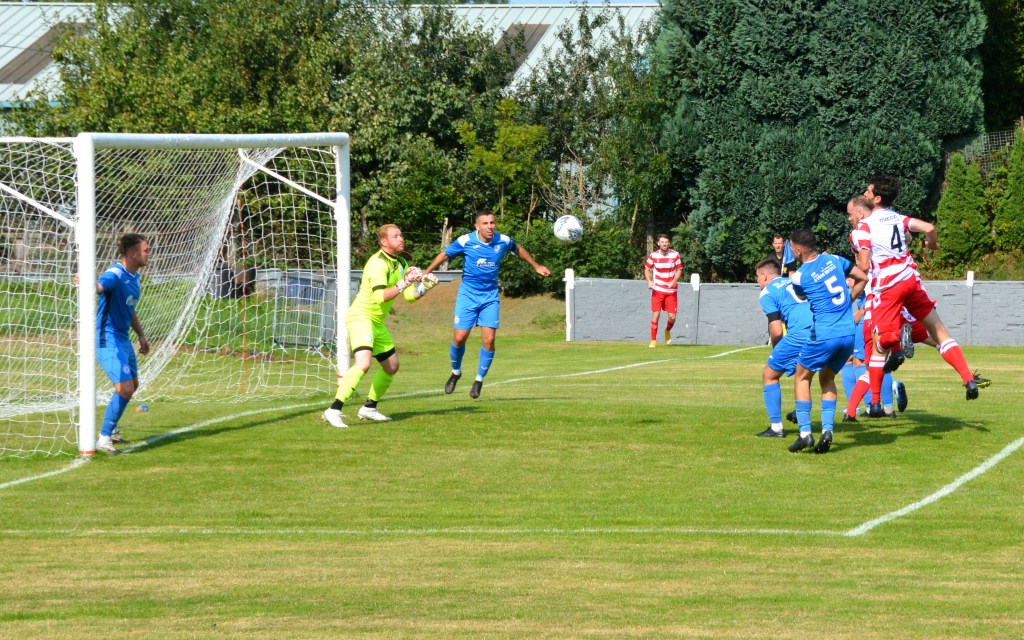 The tide however began to turn in the hosts’ favour as they began to build attack after attack from the back. Simon Eeles made a great run down the left touch line to the corner flag where he whipped a dangerous ball into the box that keeper Daniel Sloan did well to clutch cleanly under the bar.