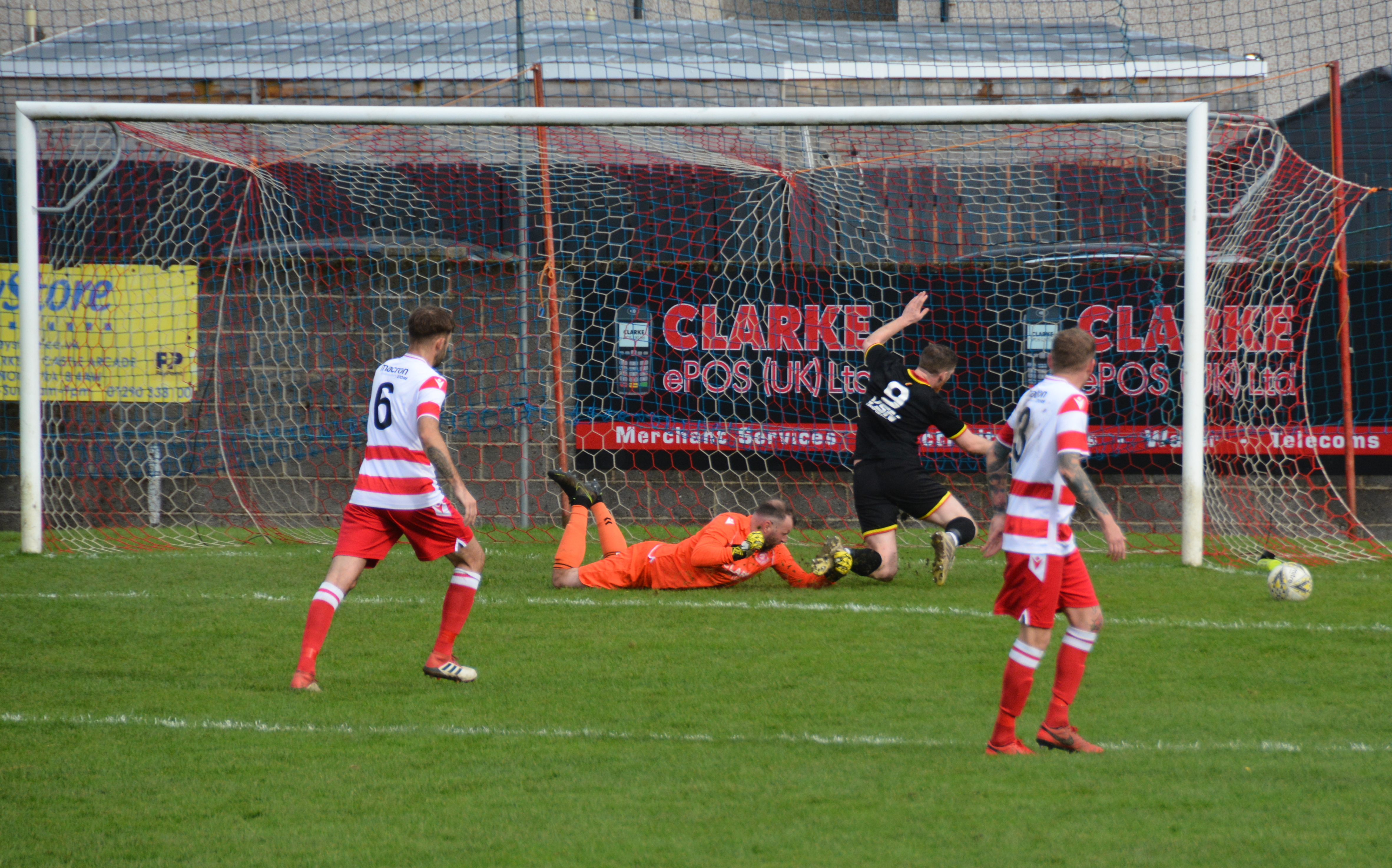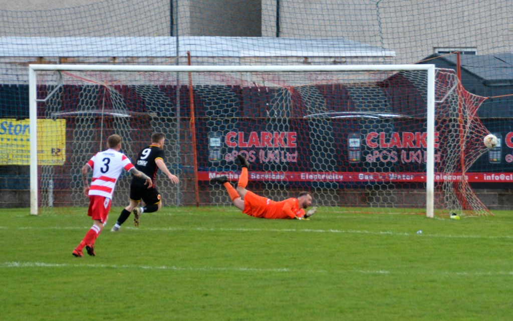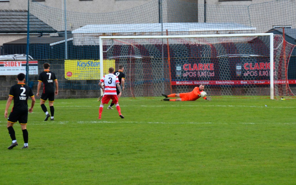 The visitors were soon back on the front foot playing fast flowing football. The impressive Josh Hogg, from the centre circle in his own half, picked out Rodger on the outskirts of the box who laid it off to McWilliams and after giving a couple of defenders the slip struck a low shot from 22 yards which McGarrity got down low to stop and then quickly reacted to punch the ball from the feet of Kerr looking for the tap in.
