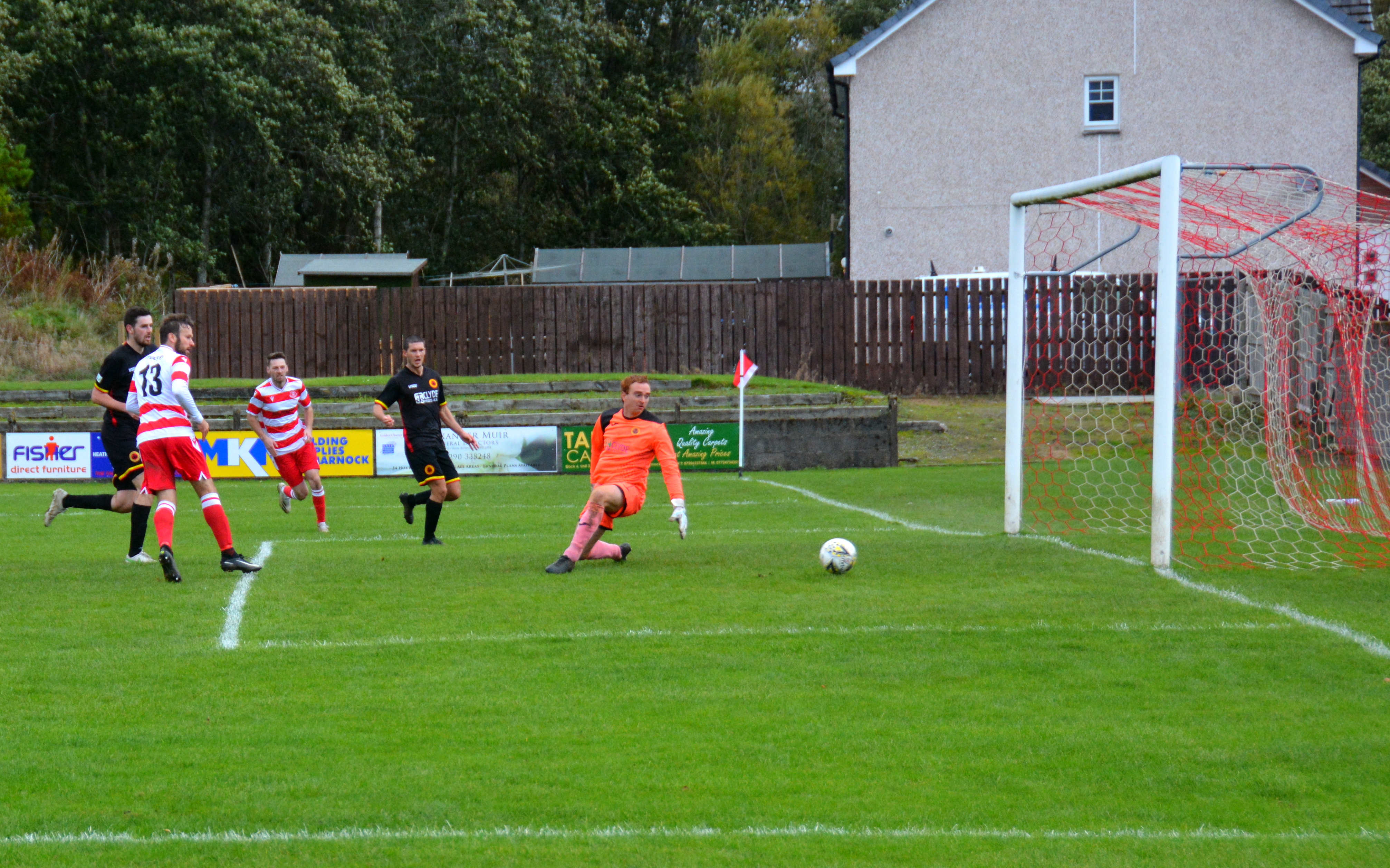 On 84 minutes Sherrie’s corner-kick was met at the edge of the six-yard box by Pettigrew to guide the ball goalward only for Gordon to block with his feet with Fisher in close attention. McKee pounced on the loose ball but his shot from 4 yards out was clawed away a yard from the goal-line by the alert goalie who then cut out McKee’s attempted cut-back with an outstretched leg before finally clutching McKee’s third attempt to fashion the equaliser.
