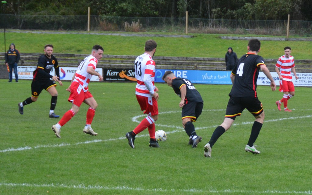 The sides were evenly matched in the early encounters, each winning a corner kick that came to nothing. From open play Rossvale’s Robbie Torrance deep on the left launched a ball into the box that the lively Rico Diack was a hair’s breadth from getting a head to it before the ball slipped wide of the post. For Glens, Ross Fisher took the bull by the horns to drive forward and play a neat one-two with David Blyth to continue his run into the box only to be robbed of the ball on the touchline by Dillon Young.