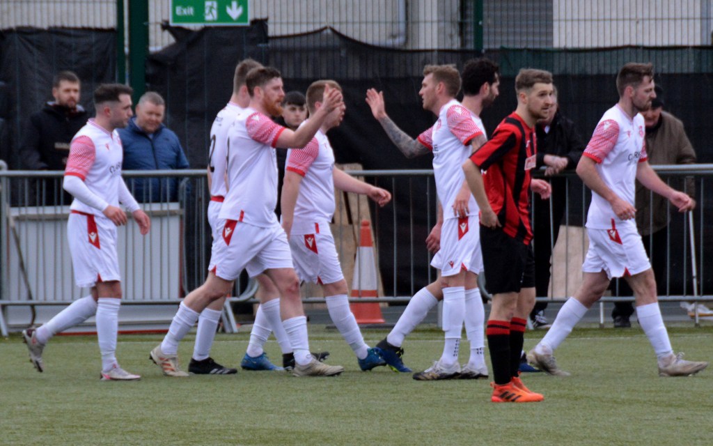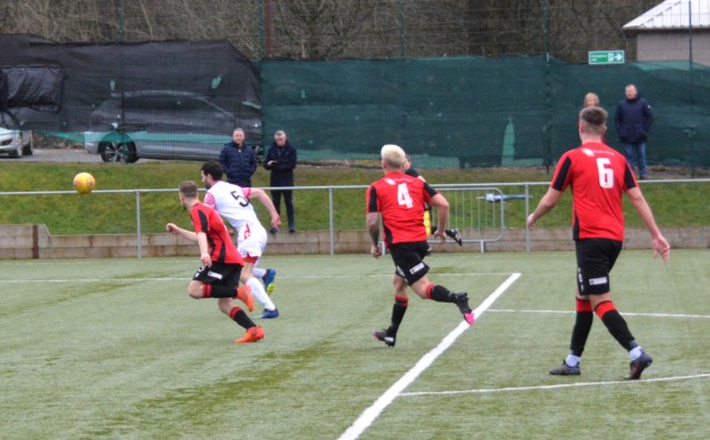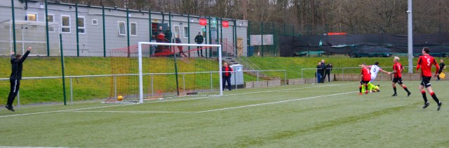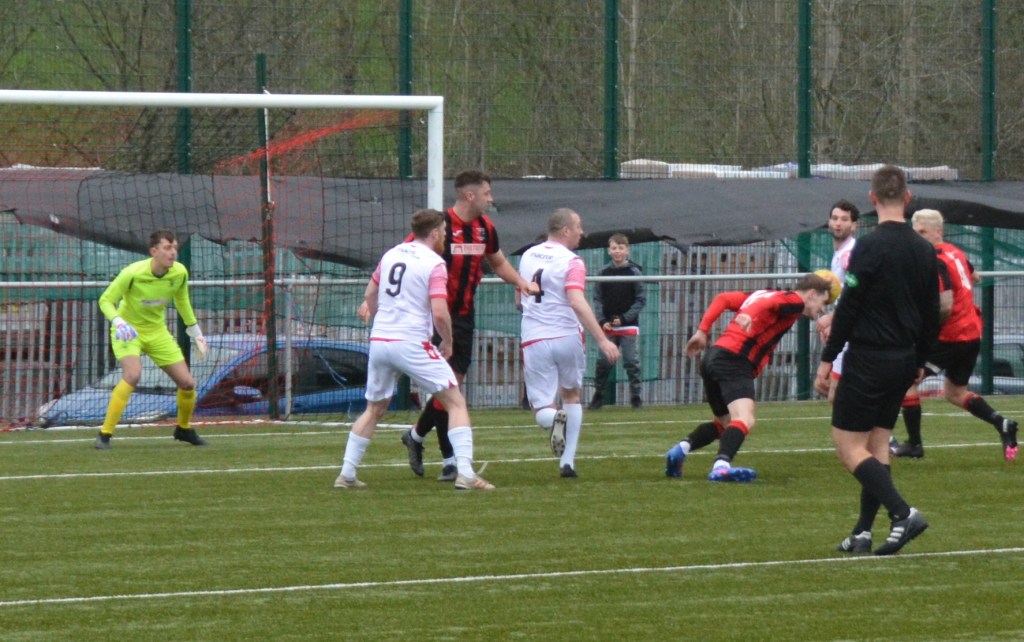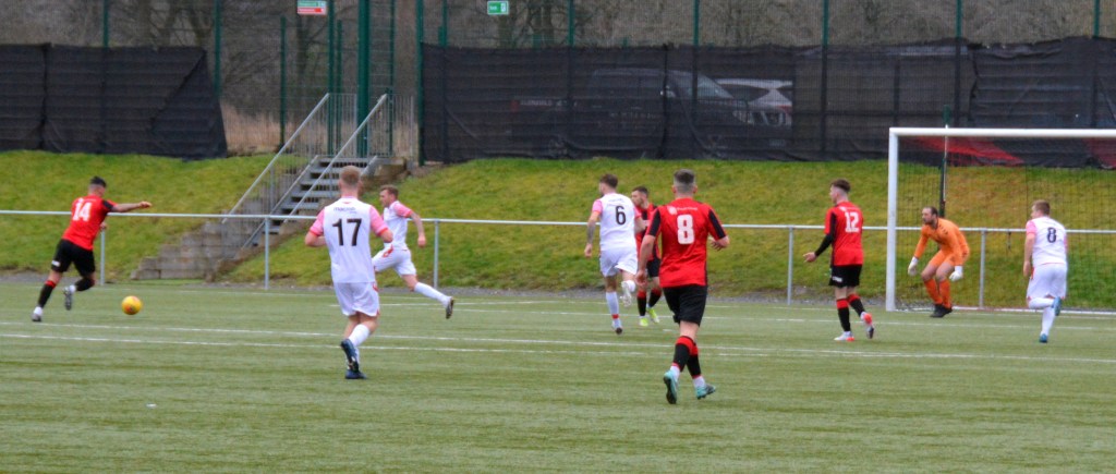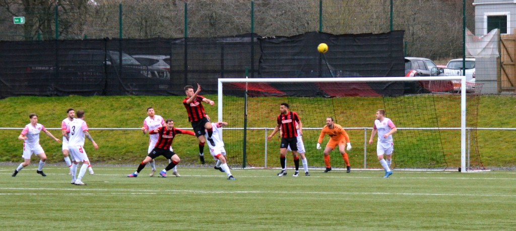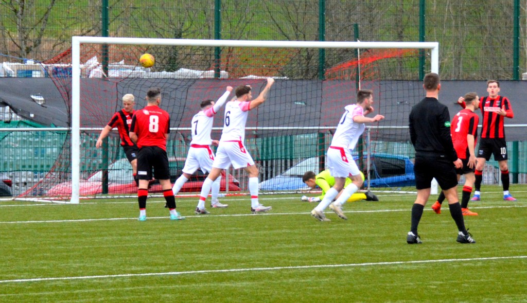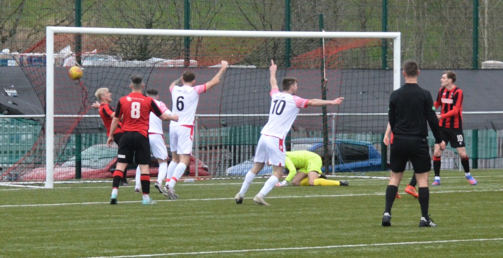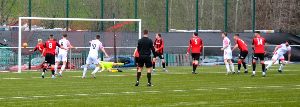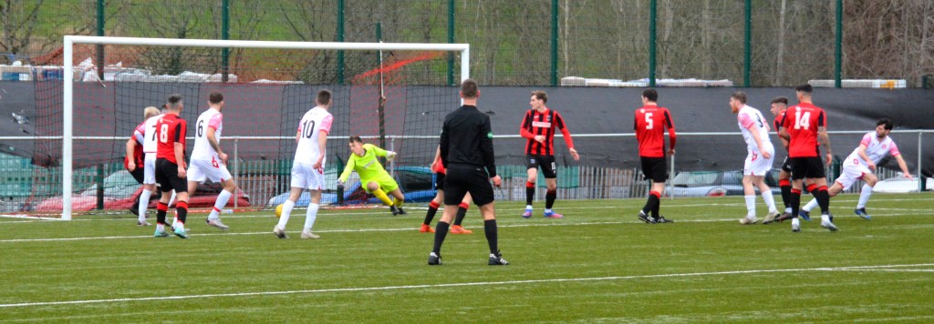 On 28 minutes the home side won a corner that Markey punched from under his bar with both fists. The visitors countered down the right through Jamie McKernon who floated a ball deep into the box which Hugh Kerr clipped to the back post for the incoming Rowe only for the keeper to clutch it cleanly.