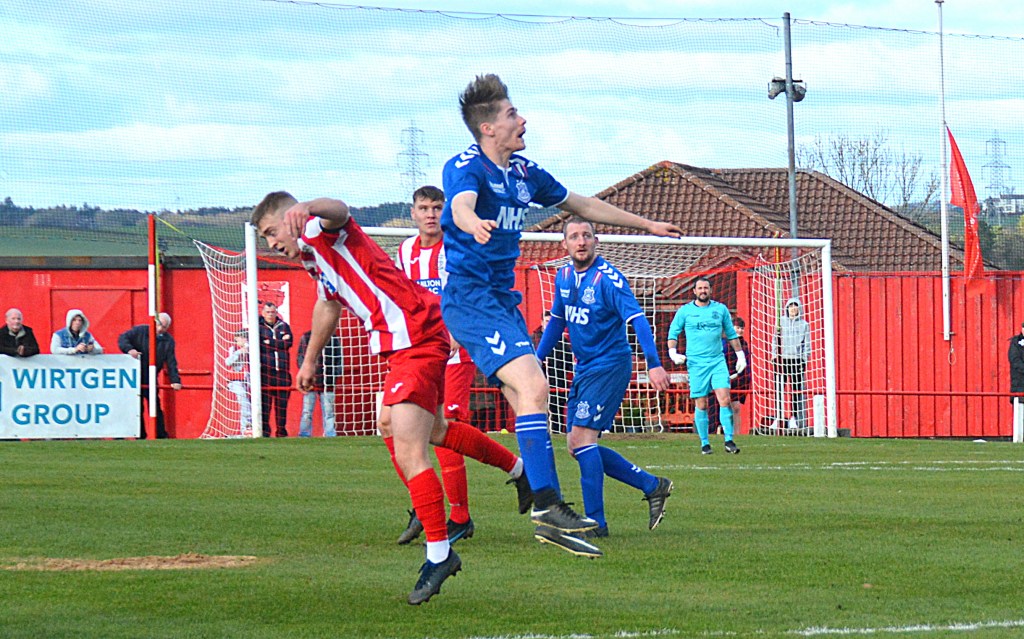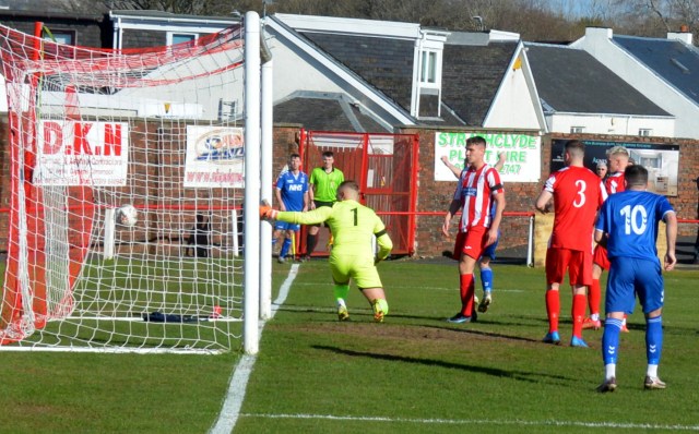 Glens started brightly with the running of Kerr and Nisbet keeping the Ford defence on their toes. However, it was the hosts that carved out the first chance of the half after Whittaker on the left cut inside only for his low angled shot to be blocked on the six-yard box by Pettigrew sending the ball into the ‘D’ where the inrushing Marc McKenzie cracked a low fizzer of a shot seemingly destined for the back of the net before Markey sprung into action to dive to his left and tip it round the post. Pettigrew won the aerial battle with Robertson to clear the corner-kick that followed.