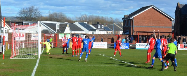 Play then went back & forth with neither box being breached before the hosts won a free-kick on 8 minutes which was floated into the six-yard box only for Chris Robertson’s close-range header to sneak inches wide of the post. Three minutes later Markey at full stretch turned a low diagonal shot from Jack Whittaker round the post and the corner-kick that followed was eventually cleared.