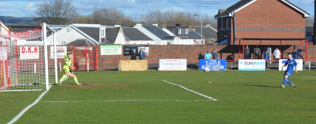 Back came Hurlford and a cross from the left to the back was headed out by Craig Pettigrew as Marc McKenzie threatened, only for the ball to be retrieved by namesake Paul McKenzie on the outskirts of the box. Taz then cut back inside giving Alan Cairns the slip before trying to do the same to Pettigrew only for the Glens captain to clip his heels and the referee to point to the spot. Up stepped Marc McKenzie but was foiled by Markey who got down low to push the ball wide of target.