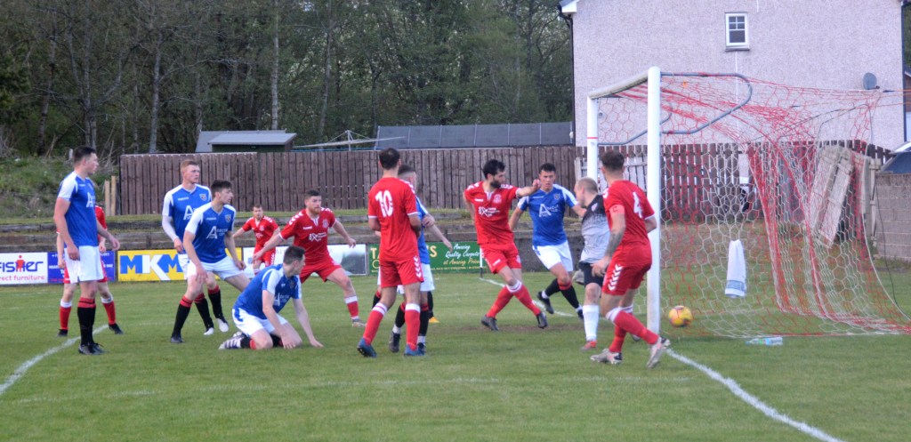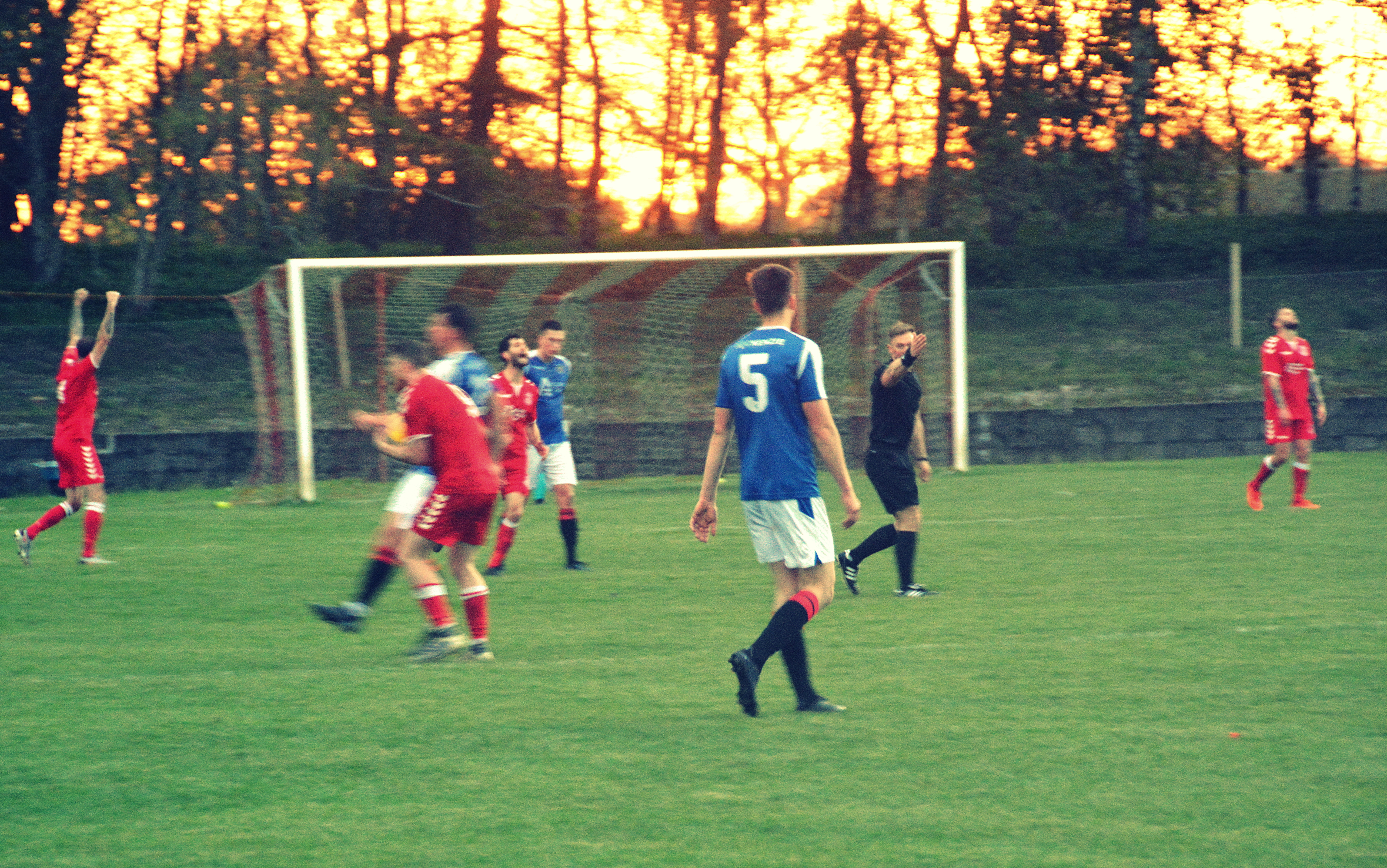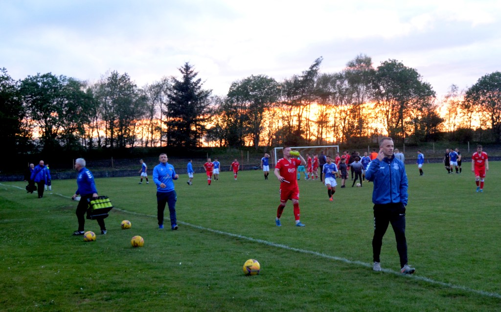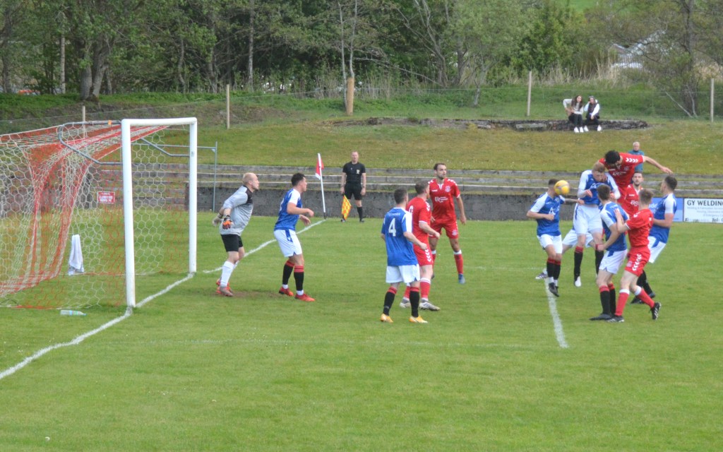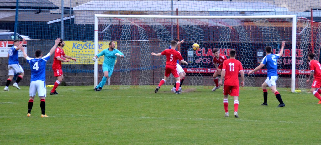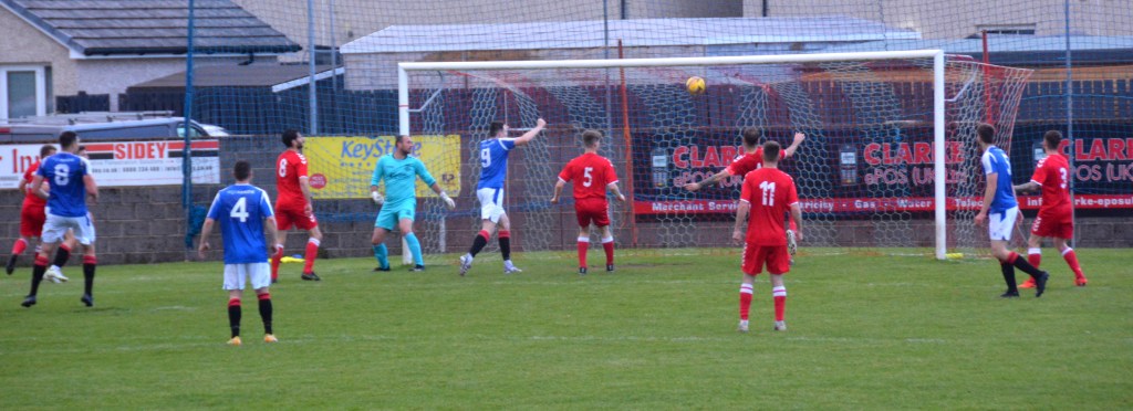 At the other end Kemp & Kerr combined deep on the right wing and if the sun hadn’t gone down Wylie and Whyte would have been chasing shadows as the Glens pair toyed with them before Kemp curled a ball to Ryan at the corner of six-yard box who rolled it back out to Kerr to drill a low shot that was deflected wide leading to back-to-back corners that were well defended by the visitors.