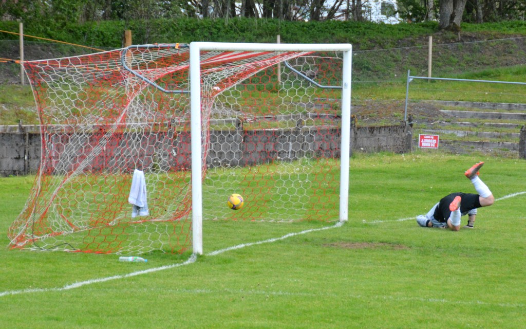 Glens continued to press. Waters had to rush to the edge of the box and boot the ball clear as Ryan made one of his trade-mark ‘never give-up’ runs in hunting the ball down. Kemp then evaded another attempted Slooves-Willit sandwich, brushing off the former and pirouetting round the latter, only for his shot from 20 yards to sail over the bar.