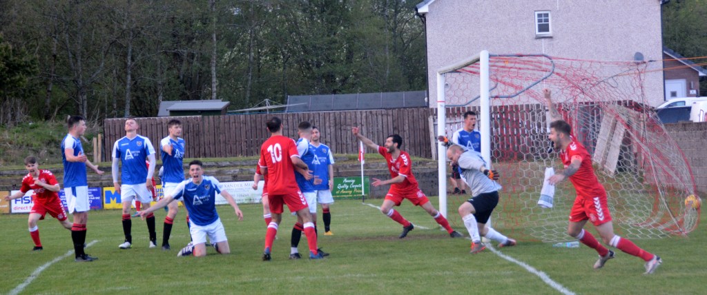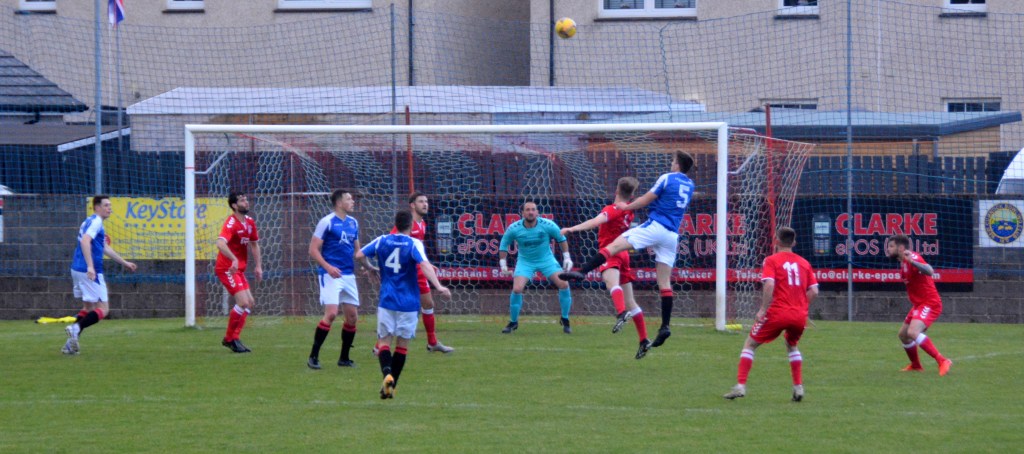 To rub salt in the wound Meadow went up the park and won a debatable free kick on the left-hand side of the Glens’ half. Willet floated the ball deep into the box where a great leap from Whyte sent the ball high into the air to the left-hand side of the box and another great leap, by Connor Boyd, sent the ball over the head of keeper David Markey at the near post seemingly net-bound at the back post only for Pettigrew’s attempt to hook it clear crash off the under-side of the bar leaving Callum Graham with a tap in from a yard out. Glens 1 Meadow 1, on 37 minutes.