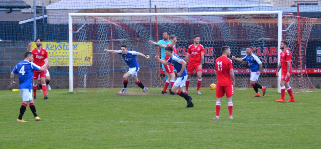 The home side won a free kick in the middle of the park some 28 yards from goal after Ollie Rowe had nicked the ball from the feet of Neil Slooves and skipped past Jared Willet before squaring it to Calvin Kemp who was quickly sandwiched between the chasing Willet and Kinlay Bilham. Jamie McKernon casually stepped up and curled the free kick over the top of the jumping Meadow wall and beyond the reach of airborne keeper Marc Waters before it dipped into the welcoming net as Jambo punched the air in delight!