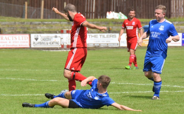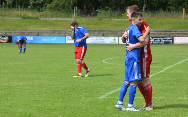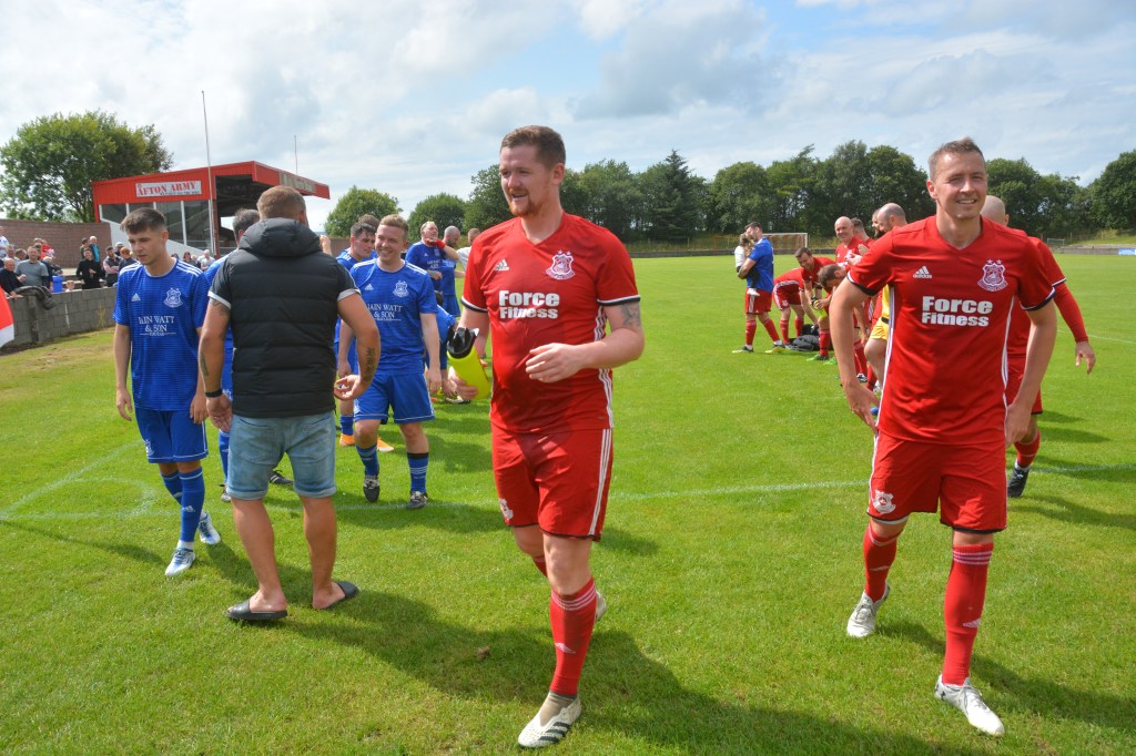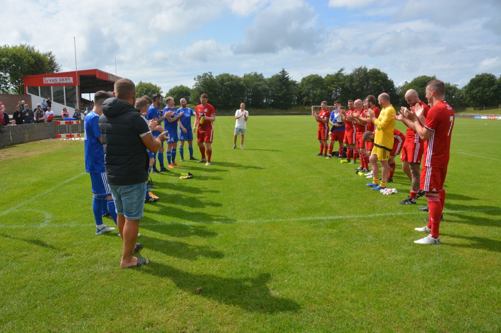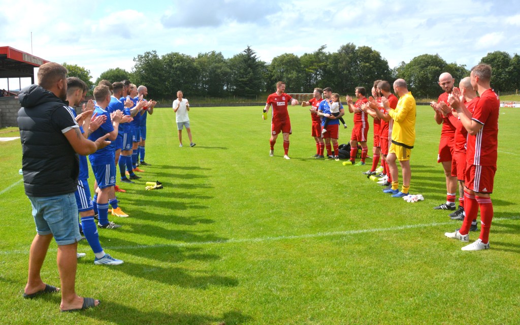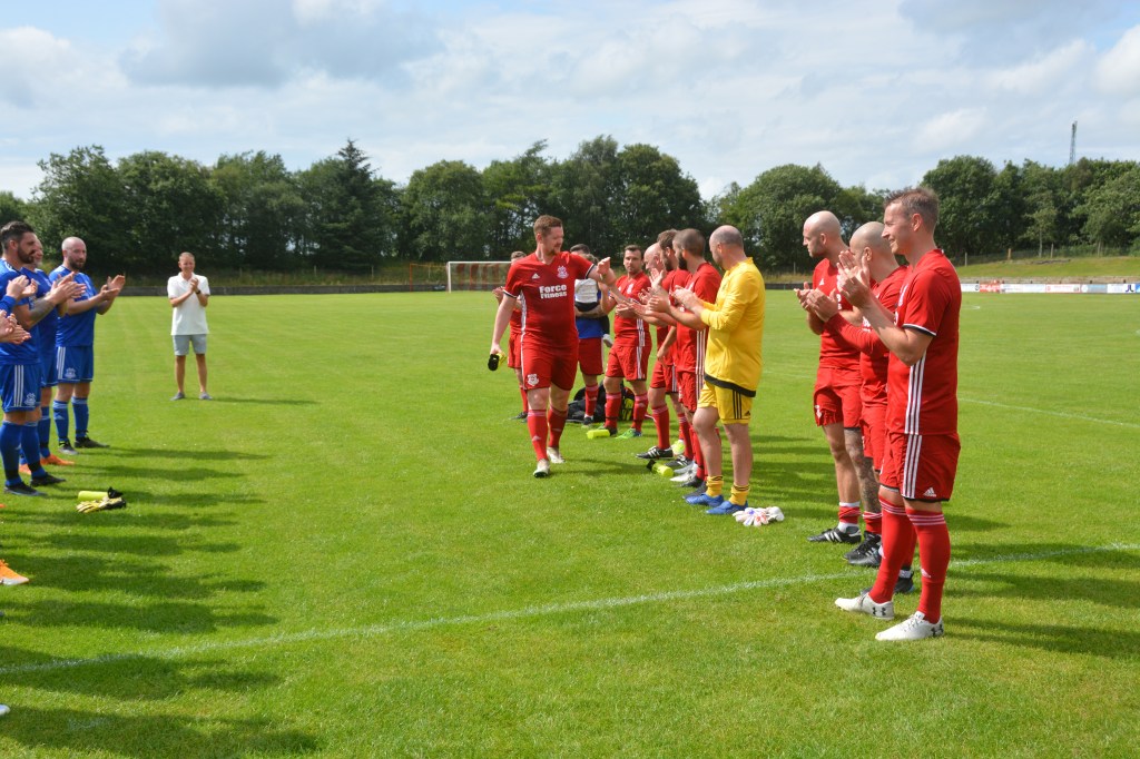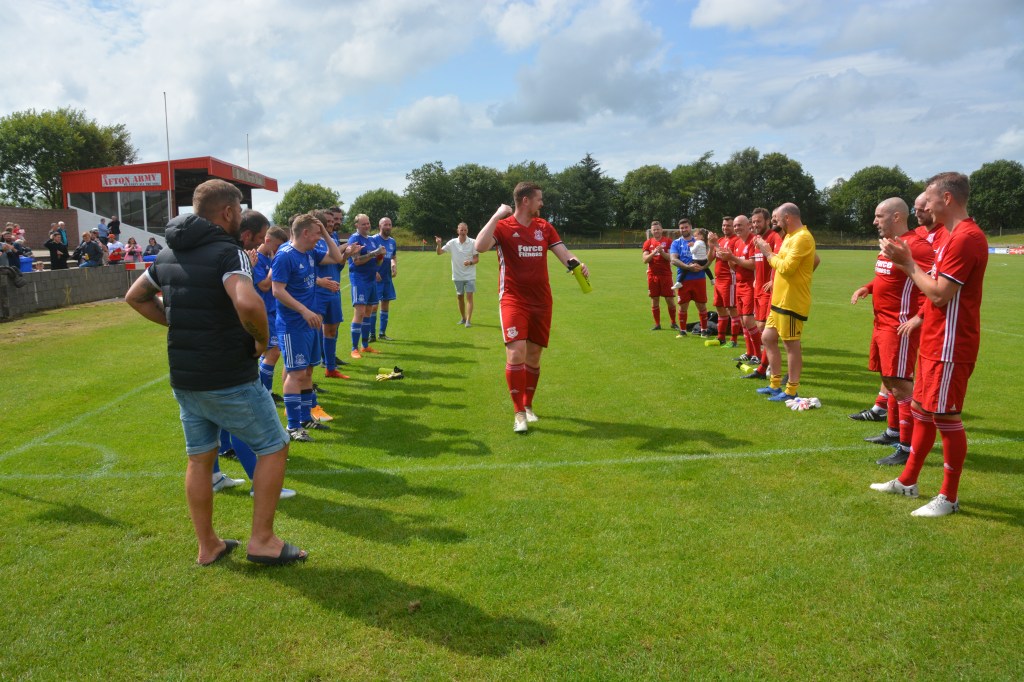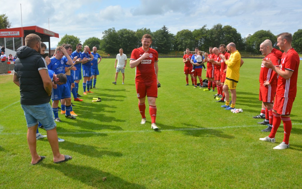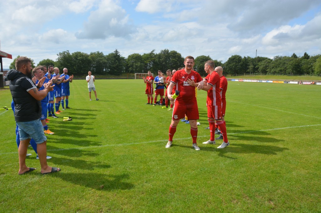 Glenafton Athletic were proud to host a testimonal match for local lad Ryan McChesney. He signed for the club in Season 2010/11 as a central defender having previously played with the successful Glens 1992 youth side as free scoring striker. Ryan played for 10 seasons up until 2019/20 and plans were in progress to mark his testimonial only for the season to close early due to COVID. The Glens closed down for the season during which time Ryan turned out for Dalbeattie Star before returning to the Glens at the start of season 2021/22 and has since moved onto Maybole. He made 300 appearance for the club scored 27 goals and his honours include those won in the Treble Season of 2016/17 – WOSFL Premier Champions, Scottish Junior Cup Winners and Evening Times Cup Winners . Add to these winners medals for West of Scotland Cup , Ayrshire Sectional Cup and Super League 1st Division Championship.
