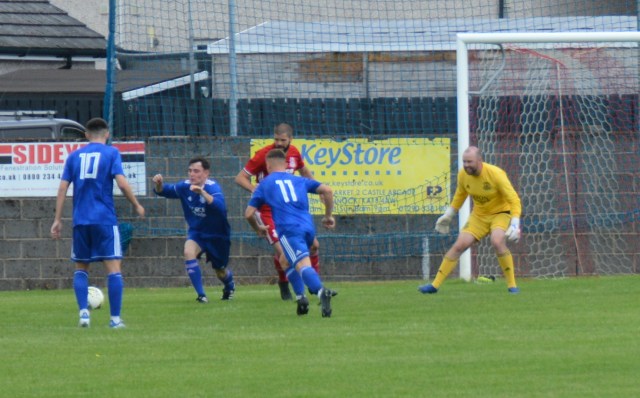 Gray clipped the corner-kick to the corner of the six-yard box where Craig Potter powered a header that was blocked on the line by the keeper and the loose ball quickly cleared upfield. McAnespie killed the ball on his chest before feeding Lynass with another inch perfect pass where from inside the ‘D’ he took a touch, as Bennie and Paddy MacDonald closed in, and cracked a shot that Kerr pushed round the post.