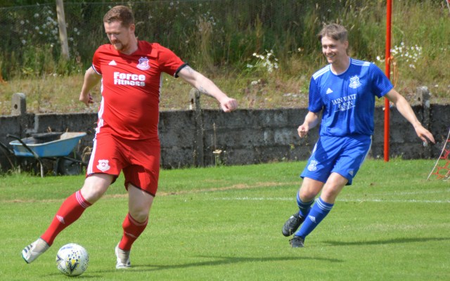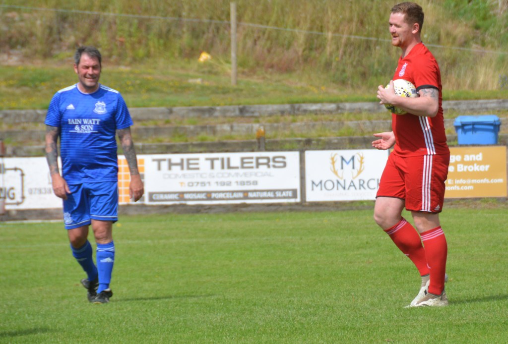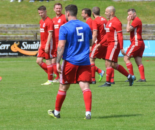 Both sides lined up for team photos before kick-off on a sun-bathed Loch Park with a good turn-out to see the local hero in his Testimonial Match. Alan Mason kindly volunteered, (after some cajoling) to be referee for the day. It proved to be a highly entertaining game that was played in a very competitive and equally good-natured manner with plenty of chances, great saves and goals galore over two halves of 40 minutes. For the purpose of the report the teams will be referred to the Reds and the Blues.