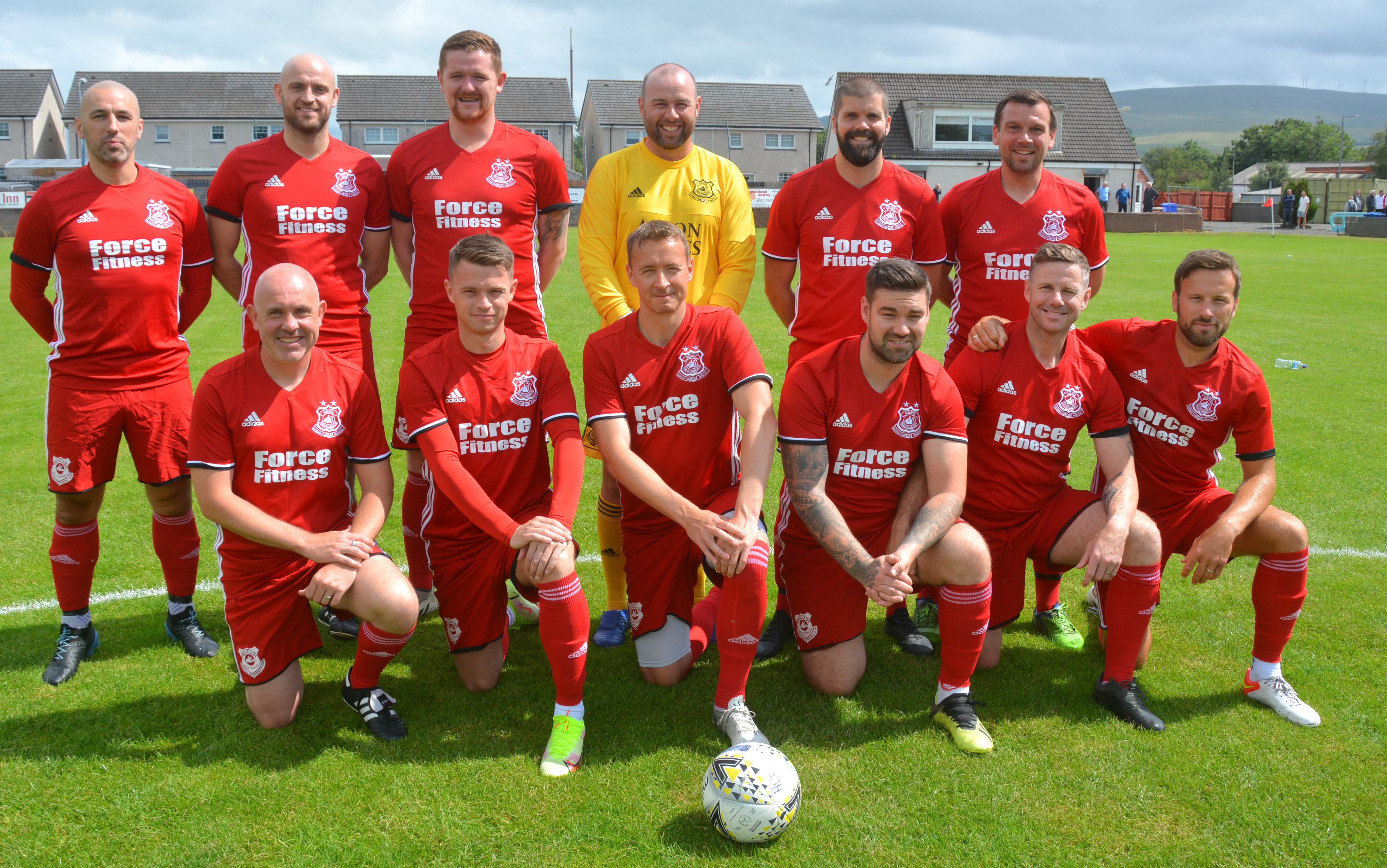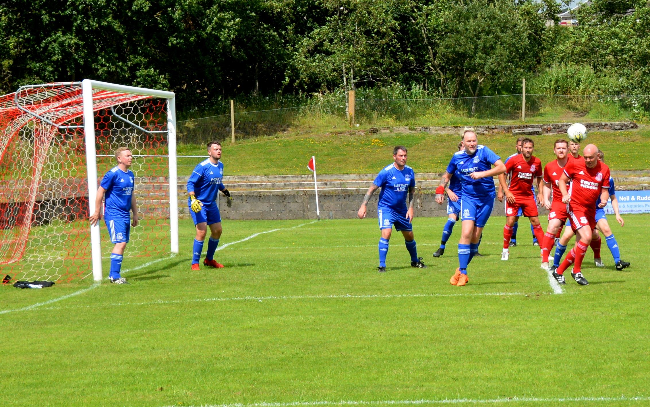 Both sides lined up for team photos before kick-off on a sun-bathed Loch Park with a good turn-out to see the local hero in his Testimonial Match. Alan Mason kindly volunteered, (after some cajoling) to be referee for the day. It proved to be a highly entertaining game that was played in a very competitive and equally good-natured manner with plenty of chances, great saves and goals galore over two halves of 40 minutes. For the purpose of the report the teams will be referred to the Reds and the Blues.