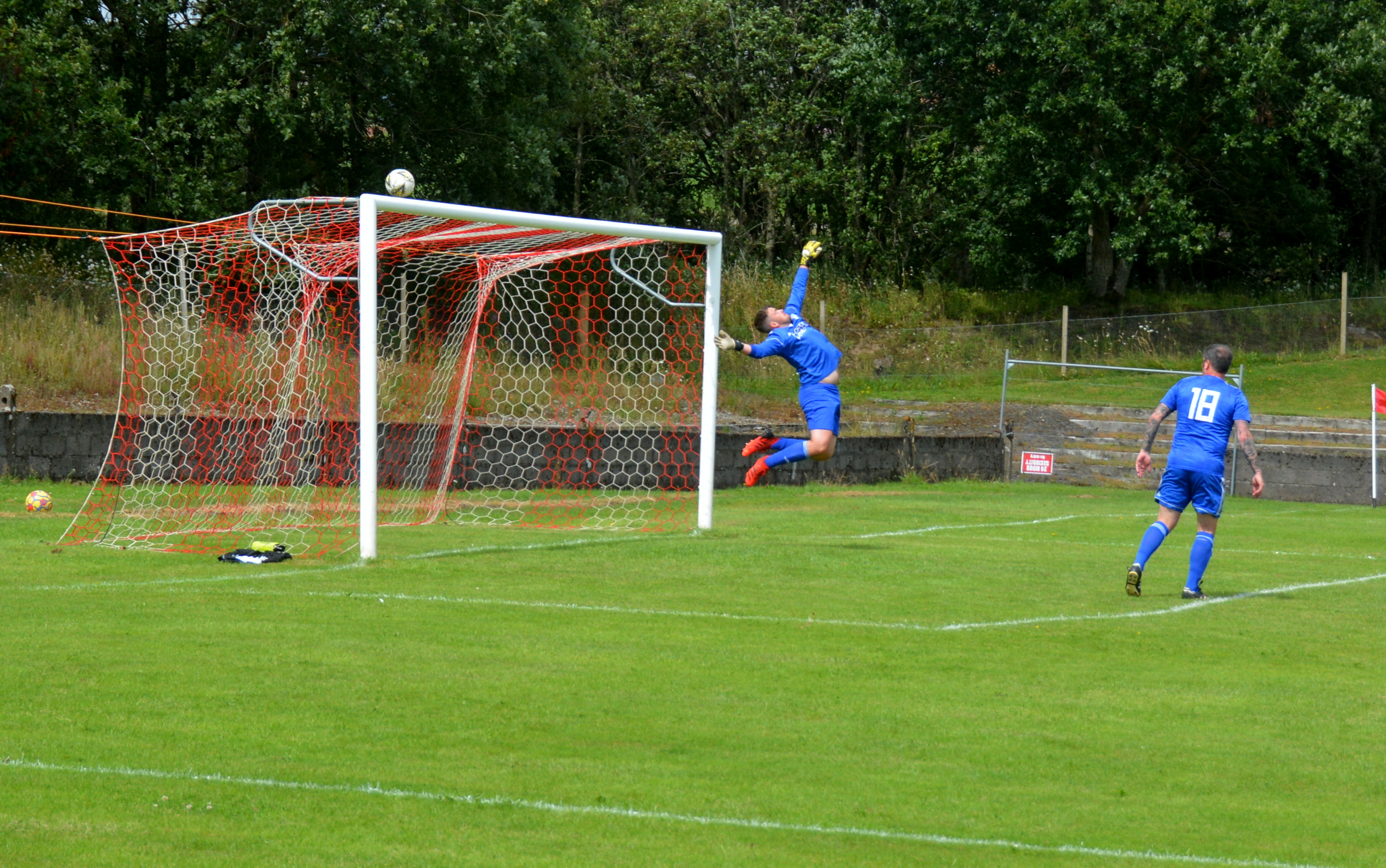 He strolled out the box with ball at his feet before a burst of speed took him past O’Kane and threading a forward pass at pace between two blues shirts to McCann in the centre circle while continuing his run to complete the one-two and gathered the ball on the half-way line. From here as Bennie & Bell closed-in he took them both out of play with the cutest of reverse passes upfield for McCann to hunt down and break into the box where he gave Hyslop the slip (literally) and then drew the keeper from his line which by this time Bennie, Bell and Zee had all arrived in the box. Now for the good or bad luck! Mick’s attempt to curl the ball round Kerr deflected off the keeper and then Bennie’s attempt to clear the loose ball cannoned over Bell’s chest and into the empty net. Reds 1 Blues 0.