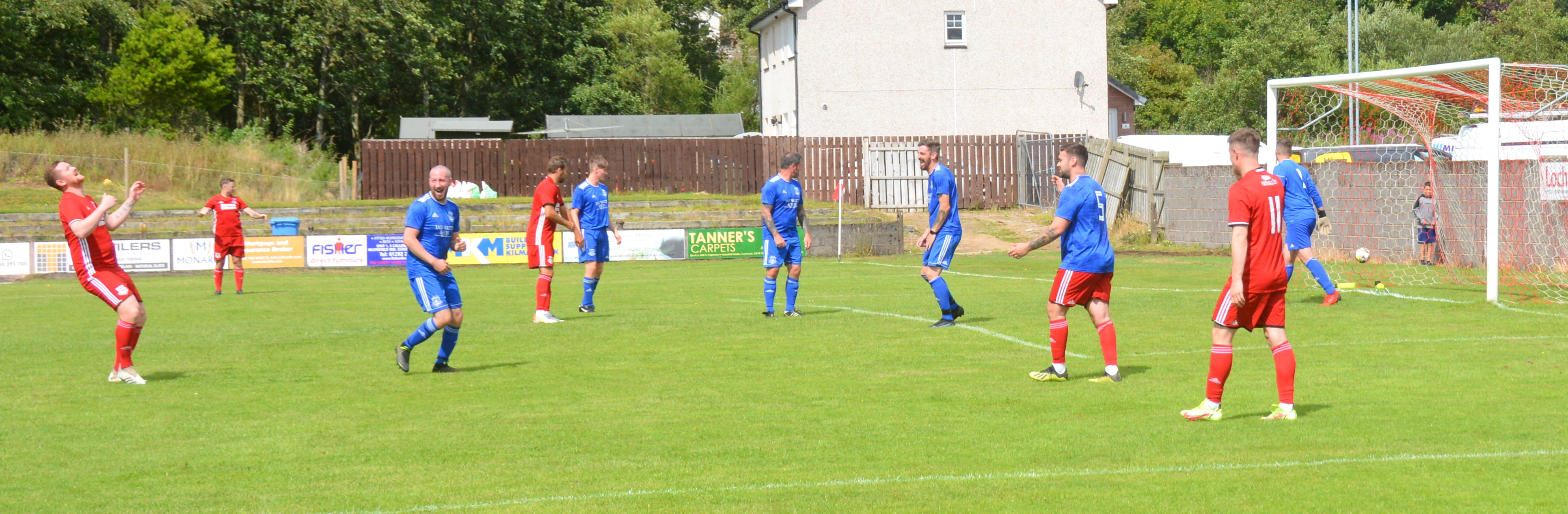 On 54 minutes the Reds won a free kick on the outskirts of the left hand side of the box. Despite the Blues setting up a three-man wall about six yards from the ball David Gray stepped up and delivered a Gray special, curling the ball over the wall and the head of a defender on the six yard line and into the top left postage stamp with the keeper rooted to the spot. Reds 2 Blues 2.