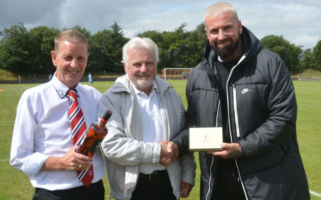 Glenafton manager Ryan Stevenson and club secretary John Stewart were delighted to present Davy Barr with a gift to acknowledge his 43 years of service on the Glenafton Committee, as well as many years at the gate – missing all those early goals! Although Davy has now retired from the committee he remains a loyal Glens supporters.