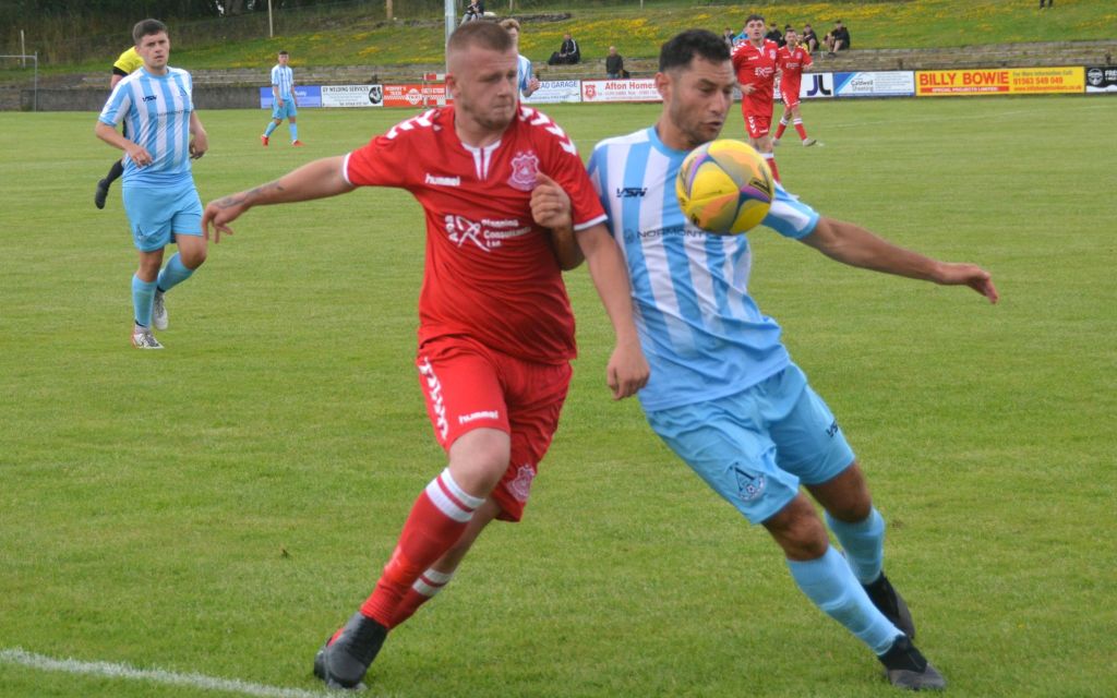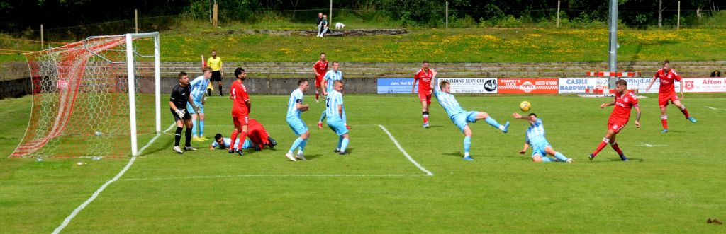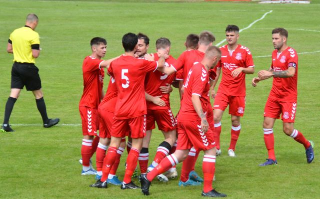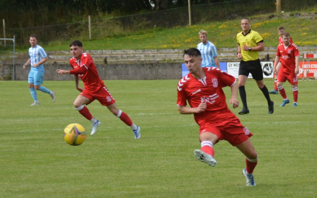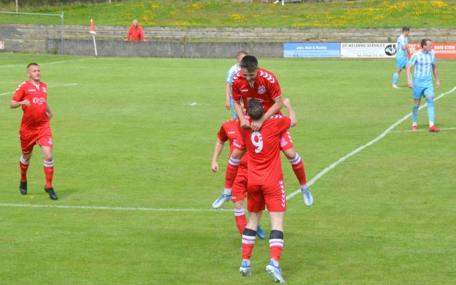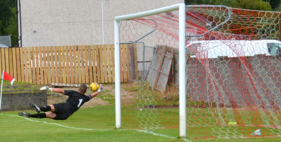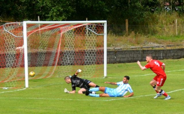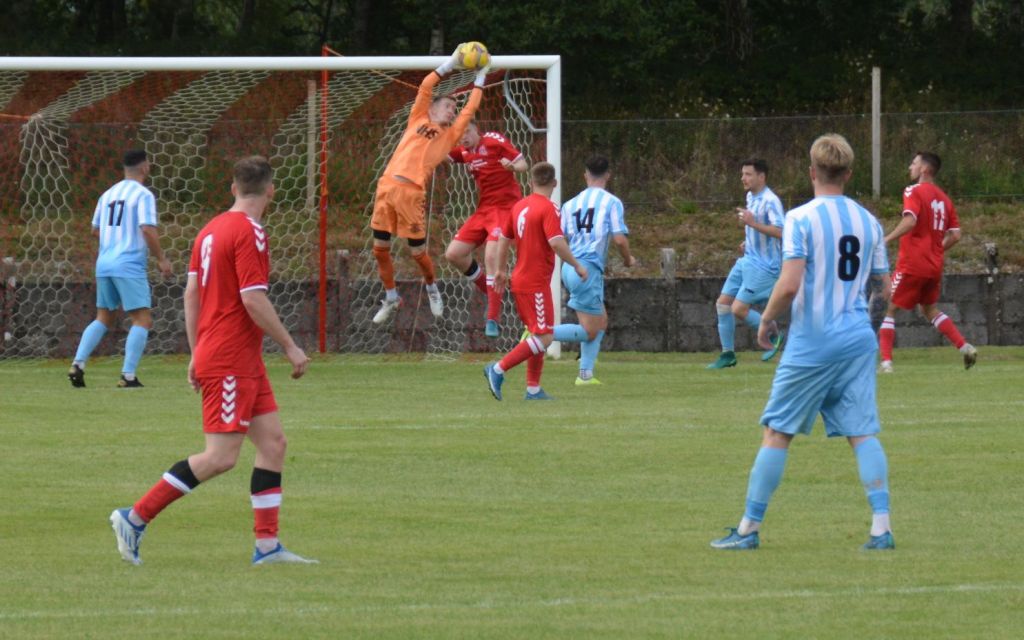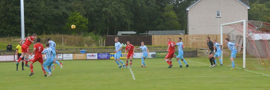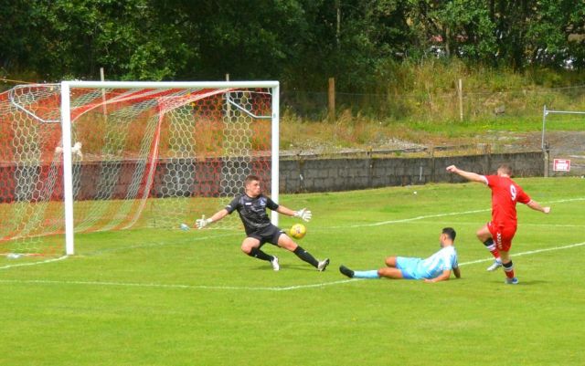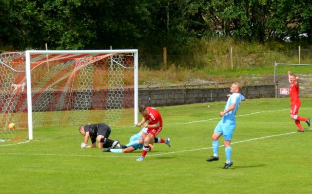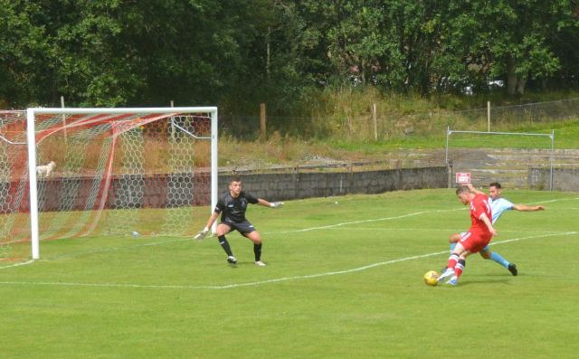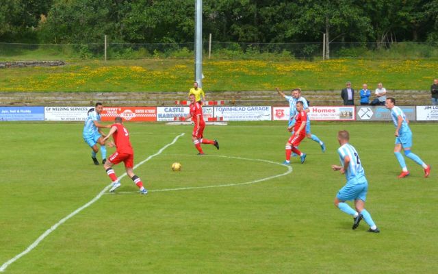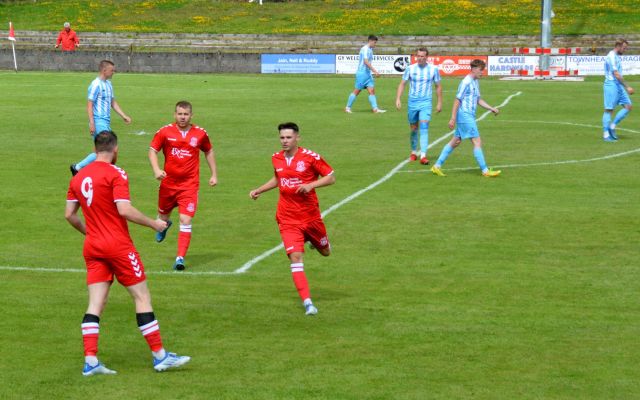 However, on 5 minutes it was the home side that took the lead after Jamie McKernon nicked the ball from the feet of Dale Simeon as he was about to square the ball to Andrew McLaughlin just inside the ‘Lie half. Jambo then broke upfield and shimmied past Lewis Magee before stroking a diagonal ball into the box for Hugh Kerr to gather and as Lance Pearce closed in, he drilled a low shot past the advancing keeper and into the corner of the net.