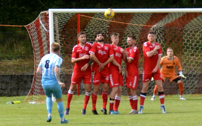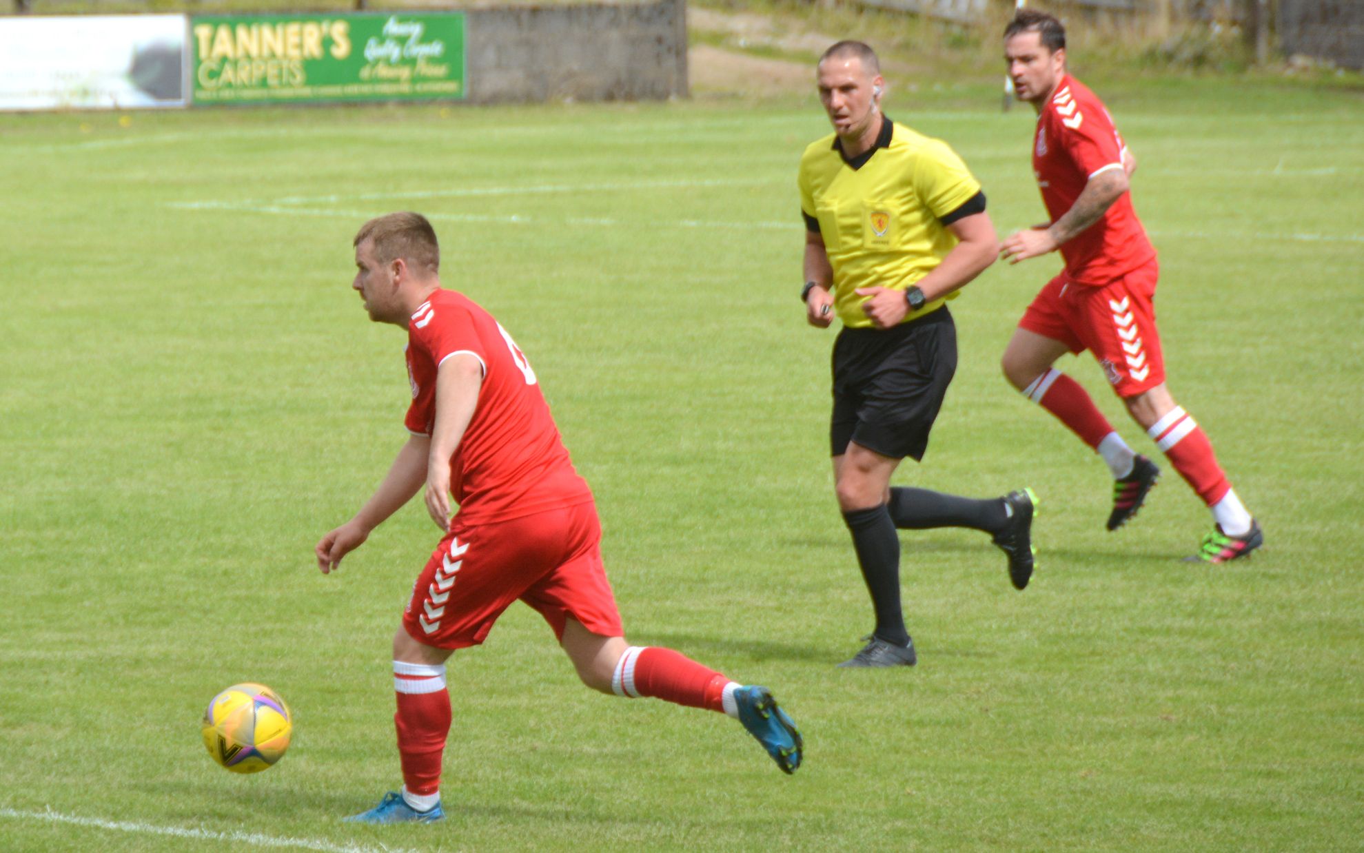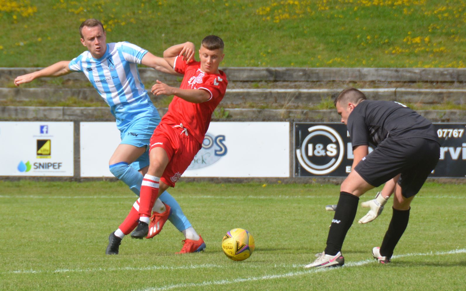 However, on 5 minutes it was the home side that took the lead after Jamie McKernon nicked the ball from the feet of Dale Simeon as he was about to square the ball to Andrew McLaughlin just inside the ‘Lie half. Jambo then broke upfield and shimmied past Lewis Magee before stroking a diagonal ball into the box for Hugh Kerr to gather and as Lance Pearce closed in, he drilled a low shot past the advancing keeper and into the corner of the net.